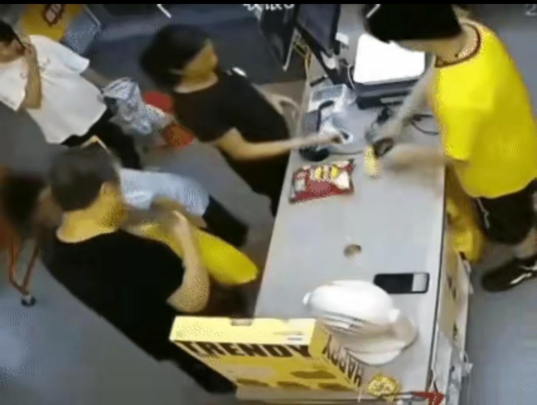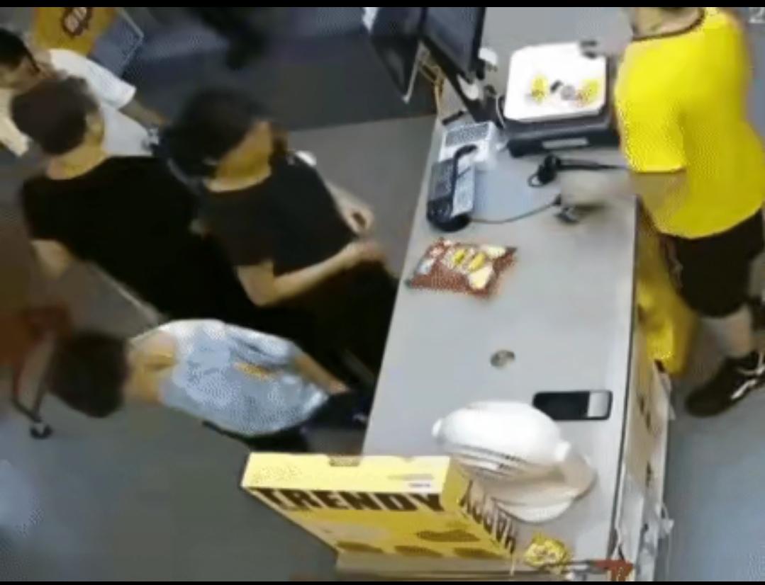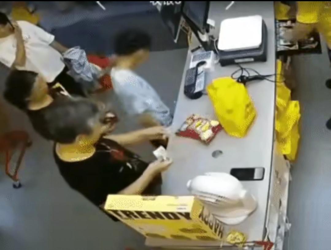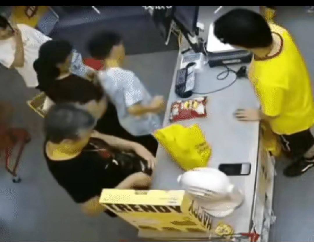 就在小男孩抬头与店员交流说着什么的时候,边上的那位大妈趁其不备,迅速拿走了小男孩放在收银台上的那张纸币。