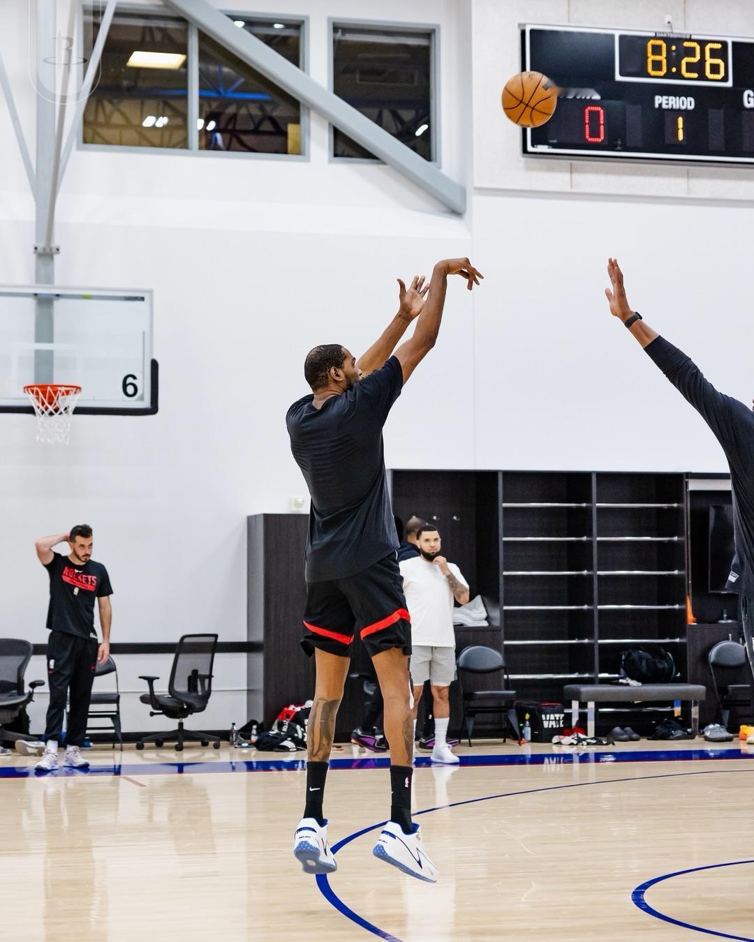 火箭社媒晒出今日队内训练照,右膝髌腱挫伤的杜兰特缠着肌内效贴以及运动胶带参与了本场训练。 作为帮助杜兰特应对髌腱挫伤的临时保护措施,用以给髌腱和膝关节减轻受力、提供稳定支撑、限制关节过度活动同时缓解疼痛。