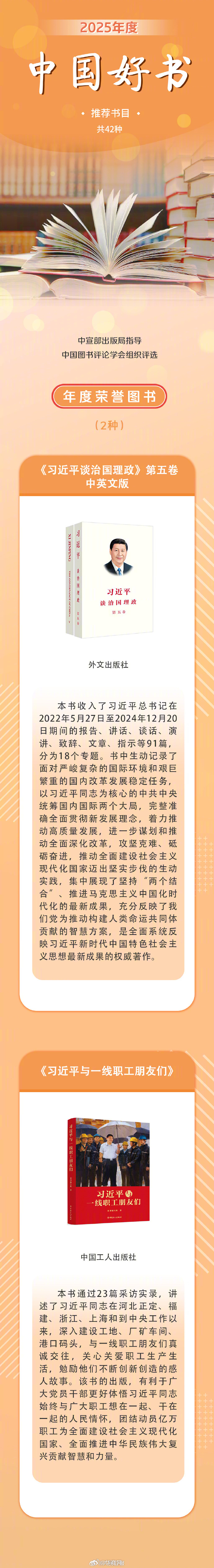 #又有书单能跟着读了#【转存读起来!#42种图书入选2025年度中国好书#】在中宣部指导下,由中国图书评论学会组织评选的2025年度“中国好书”日前揭晓,共有42种图书入选。其中,年度荣誉图书2种,主题出版类7种,人文社科类10种,文学艺术类10种,科普生活类3种,少儿类10种。另有14种图书入围2025年度“中国好书”。
