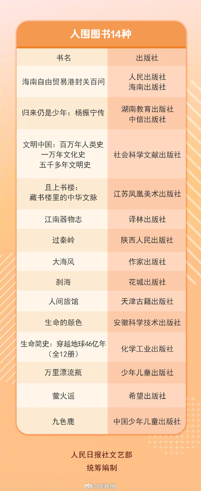 其他入围图书为:《海南自由贸易港封关百问》(本书编写组编著,人民出版社、海南出版社),《归来仍是少年:杨振宁传》(林开亮著,张婷婷绘,湖南教育出版社、中信出版社),《文明中国:百万年人类史 一万年文化史 五千多年文明史》(中国社会科学院考古研究所编著,社会科学文献出版社),《且上书楼:藏书楼里的中华文脉》(顾道远、鲁青编,童德田等著,江苏凤凰美术出版社),《江南器物志》(徐风著,译林出版社),《过秦岭》(王洁著,陕西人民出版社),《大海风》(赵德发著,作家出版社),《刹海》(陈楸帆著,花城出版社),《人间旅馆》(陈年喜著,天津古籍出版社),《生命的颜色》(史钧著,谢超奇绘,安徽科学技术出版社),《生命简史:穿越地球46亿年》(全12册)(贾跃明主编,刘树臣、王原、王永栋副主编,央美阳光绘,化学工业出版社),《万里漂流瓶》(冯与蓝著,少年儿童出版社),《萤火谣》(温燕霞著,希望出版社),《九色鹿》(谭盾著,尧立绘,中国少年儿童出版社)。网页链接