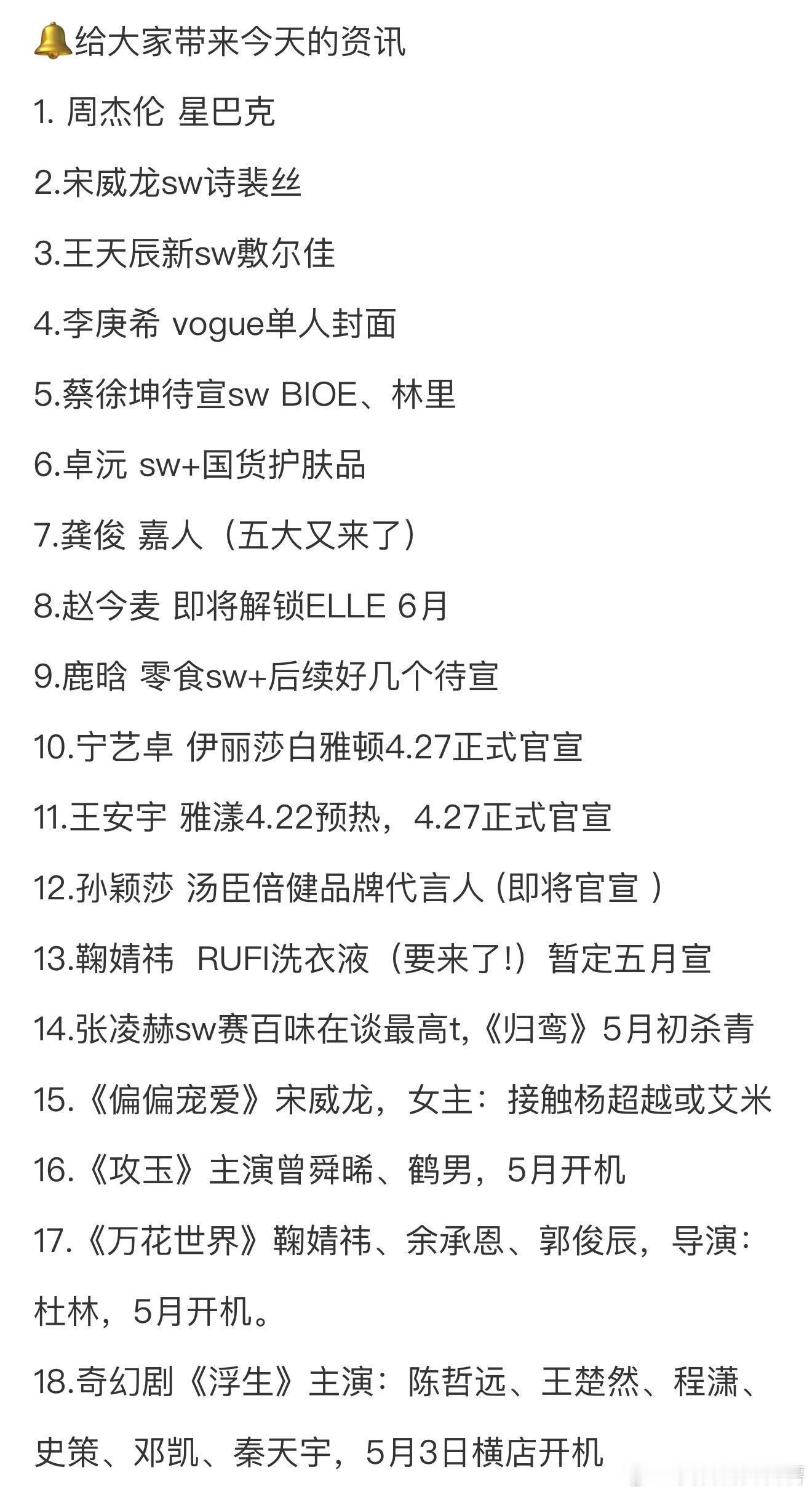 刚刚!信息量巨大!4.21圈内小🍉🔔给大家带来今天的资讯1. 周杰伦 星巴克2.宋威龙sw诗裴丝3.王天辰新sw敷尔佳4.李庚希 vogue单人封面5.蔡徐坤待宣SW BIOE、林里6.卓沅 sw+国货护肤品7.龚俊 嘉人(五大又来了)8.赵今麦 即将解锁ELLE 6月9.鹿晗 零食sw+后续好几个待宣10.宁艺卓 伊丽莎白雅顿4.27正式官宣11.王安宇 雅漾4.22预热,4.27正式官宣12.孙颖莎 汤臣倍健品牌代言人(即将官宣)13.鞠婧祎F RUFI洗衣液(要来了!)暂定五月宣14.张凌赫sw赛百味在谈最高t,《归鸾》5月初杀青15.《偏偏宠爱》宋威龙,女主:接触杨超越或艾米16. 《攻玉》主演曾舜晞、鹤男,5月开机17. 《万花世界》鞠婧祎、余承恩、郭俊辰,导演:杜林,5月开机。18.奇幻剧《浮生》主演:陈哲远、王楚然、程潇、史策、邓凯、秦天宇,5月3日横店开机23.李现 科大讯飞墨水屏系列 预热4.23正式官宣啦李现官宣这个新代言太 了,是那个被称为“AI国家队”的 科大讯飞 吗?!出手就是高端局,我们现哥还是太全面了!待播剧《长风起》刚发布预告,新剧《雾里青》也官宣了,一整个期待住!