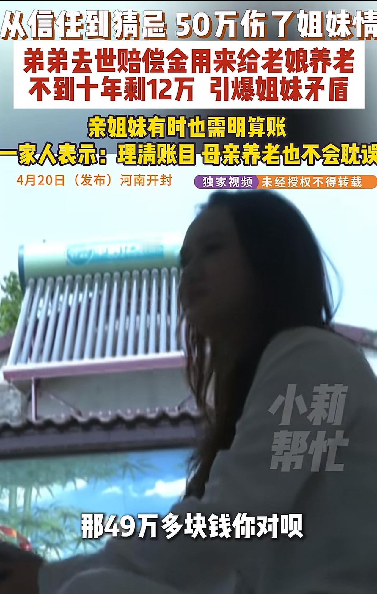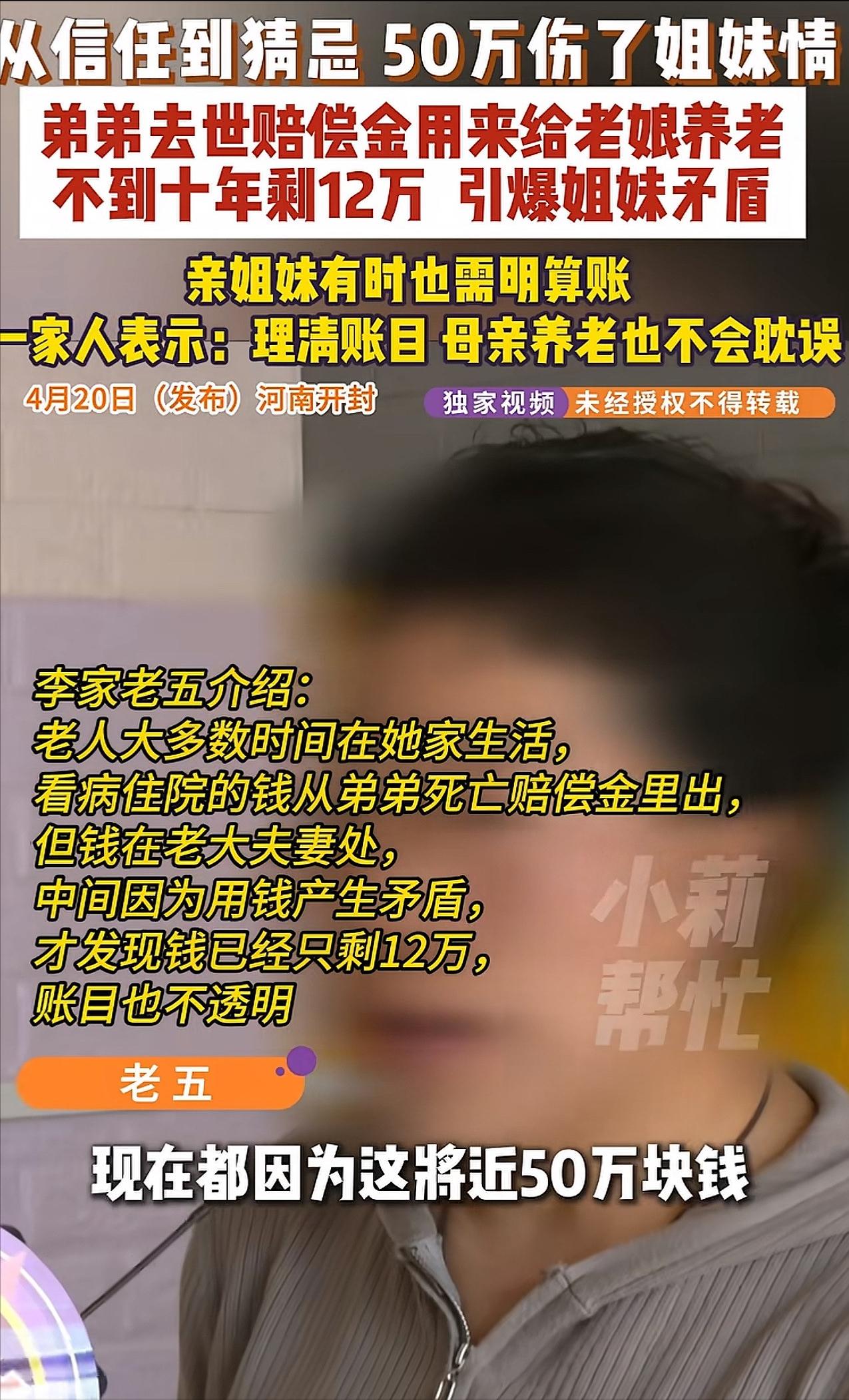 [中国赞]4月20日,河南开封,男子去世留下49.7万赔偿金,5个姐姐商量后决定将这笔钱给母亲作养老金,谁都不花不用。10多年后母亲需用钱,姐妹取钱时发现卡上只剩不到12万,查看流水发现大姐在赔偿金到账后分两次取出36万。姐妹向大姐讨要说法,大姐要与她们断绝关系,还称不管母亲生死。姐妹寒心,找来媒体介入,没想到大姐夫又给出不同说法。