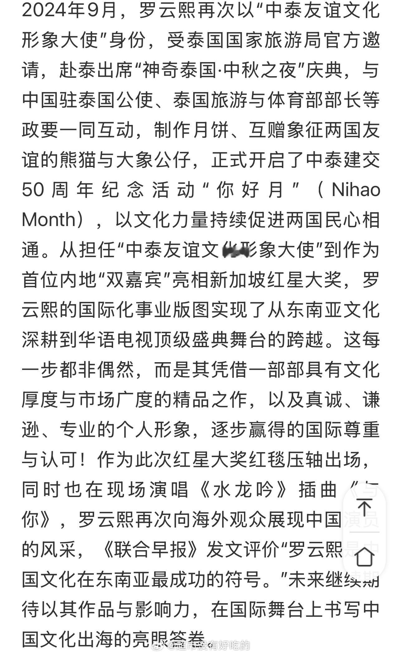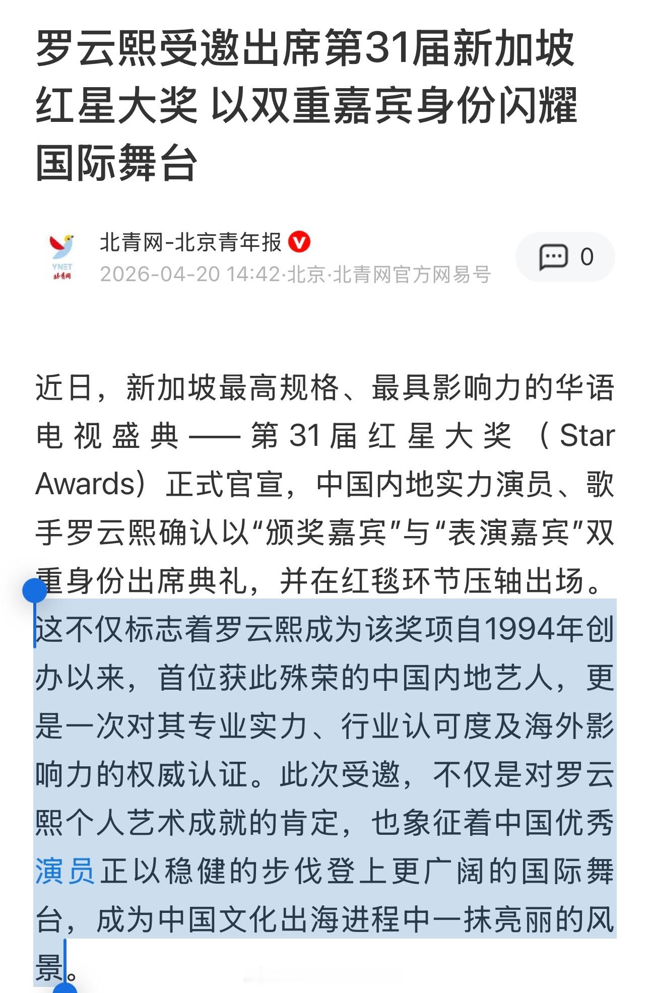 北青网-北京青年报:罗云熙以双重嘉宾身份闪耀新加坡这不仅标志着罗云熙成为该奖项自1994年创办以来,首位获此殊荣的中国内地艺人,更是一次对其专业实力、行业认可度及海外影响力的权威认证