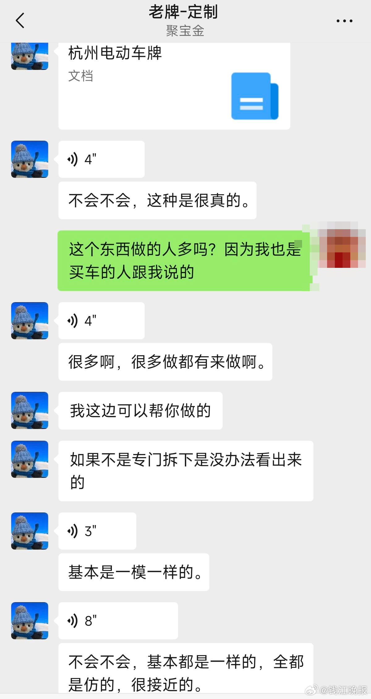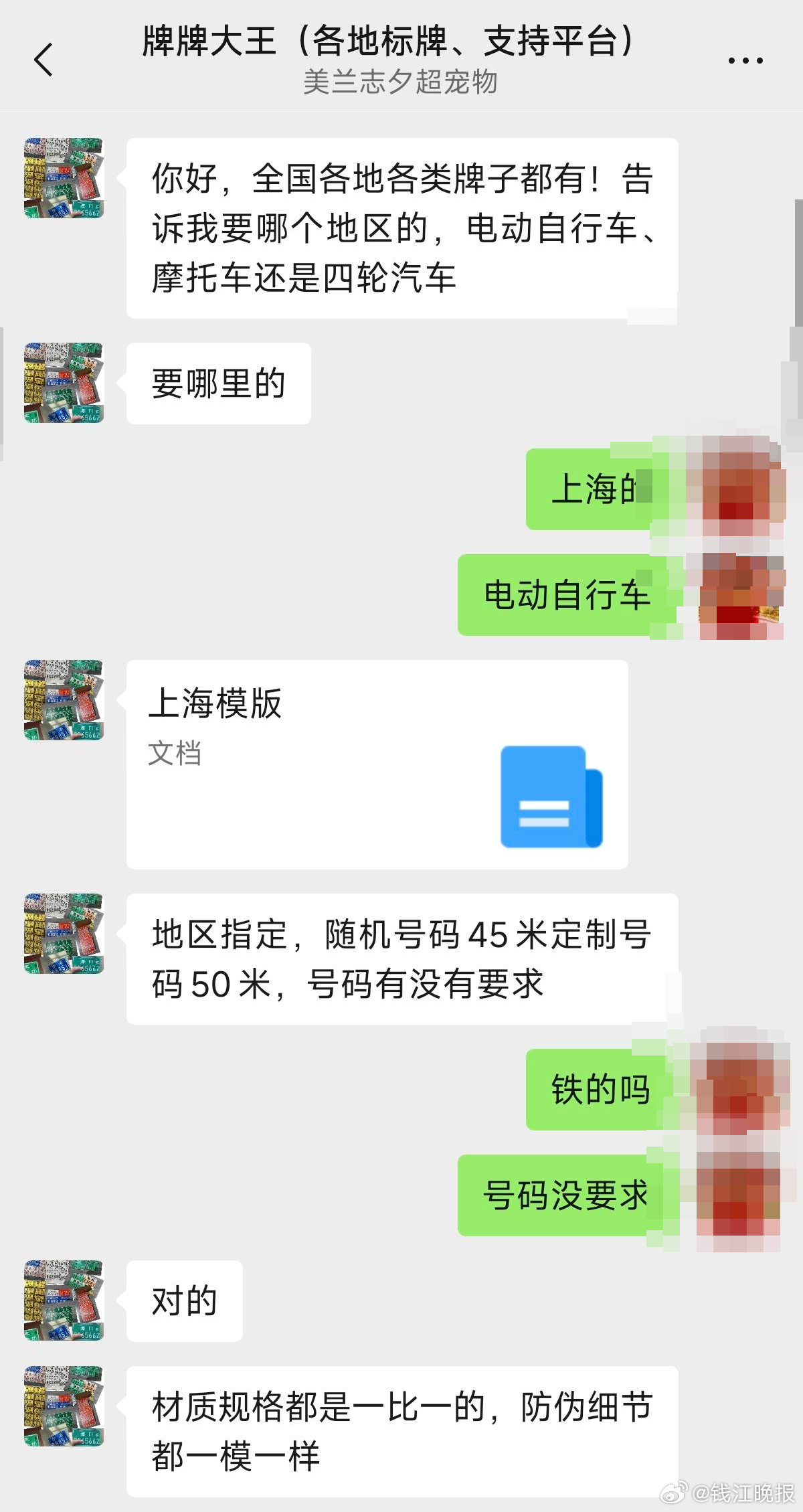 在某二手交易平台,输入“电动车牌照”,立即出现数十家相关店铺,店铺名称和商品描述中多标注“定制各类绿牌、白牌”“电动车出入牌”等字样,隐晦暗示可定制假牌。记者随机咨询一家店铺,客服并未在平台内直接回复,而是通过语音电话告知:“这个牌照比较敏感,不能在淘宝平台交易,需要加微信或QQ沟通下单。”添加商家微信后,对方直言可“一比一复刻”全国各城市的电动自行车号牌,车牌号码可随机生成,也可按需定制,字体、颜色、尺寸均与真牌高度仿真,甚至可仿制二维码。“如果随机号码单块售价45元,指定号码单块50元,批量购买可优惠。”商家介绍道。
