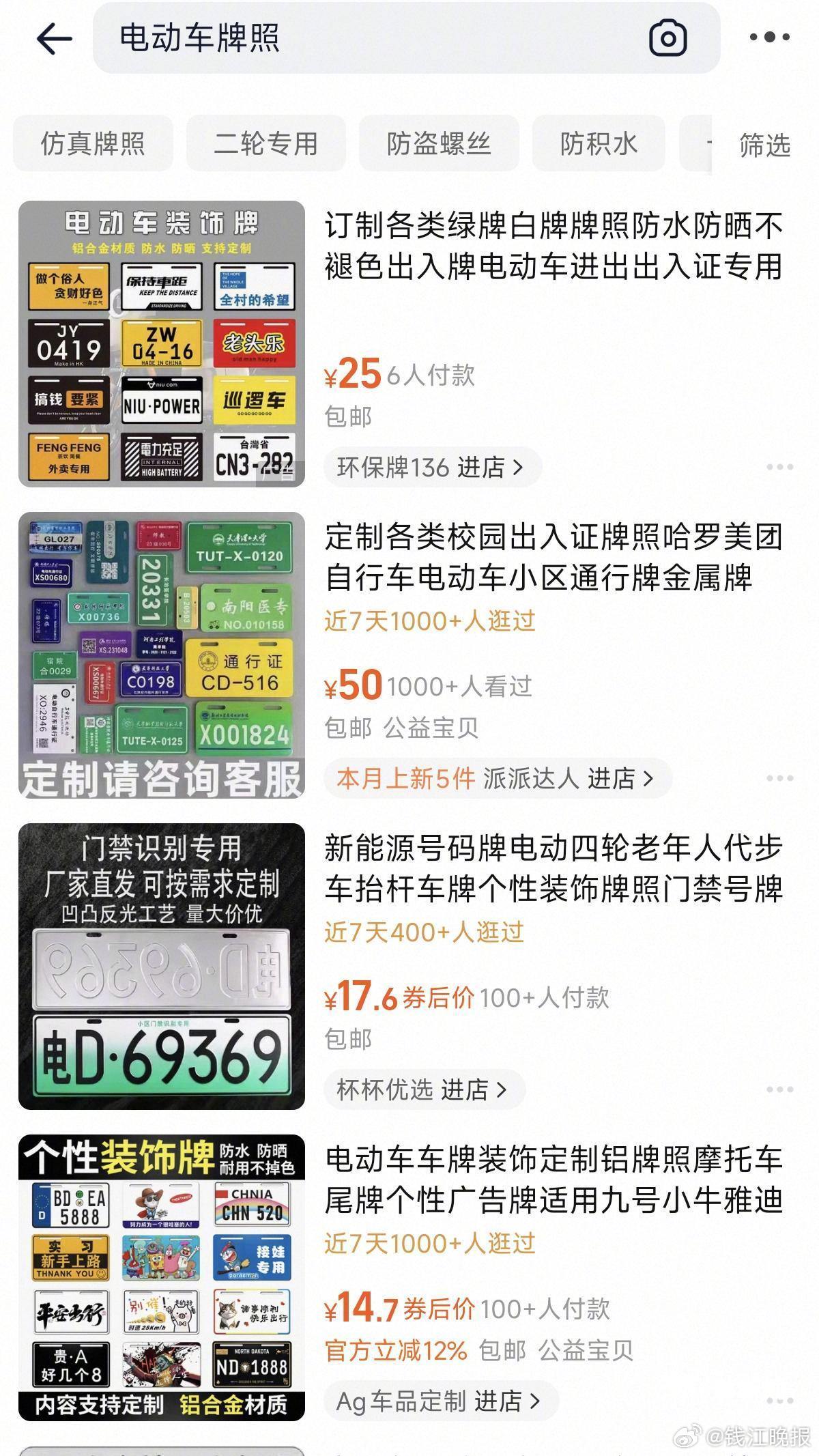 【线上平台藏玄机:假牌制售形成“产供销”完整链条】线下电动自行车牌照乱象的背后,是线上平台日益猖獗的假牌制售行为。根据一位电动自行车店铺老板的指引,记者在多个网上平台检索发现,大量商家以“个性车牌”“电动车配件”“出入证”为掩护,公开售卖、定制伪造的电动自行车号牌,形成了“设计-制作-销售-物流”的完整黑色产业链。