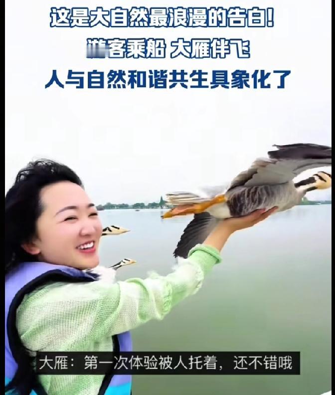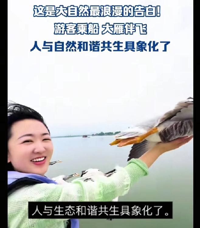 武汉女子驾船出游,竟被一群大雁主动相伴,更神奇的是,一只大雁稳稳落在她掌心,还保持着展翅飞翔的姿态,这画面直接美上人民日报。
