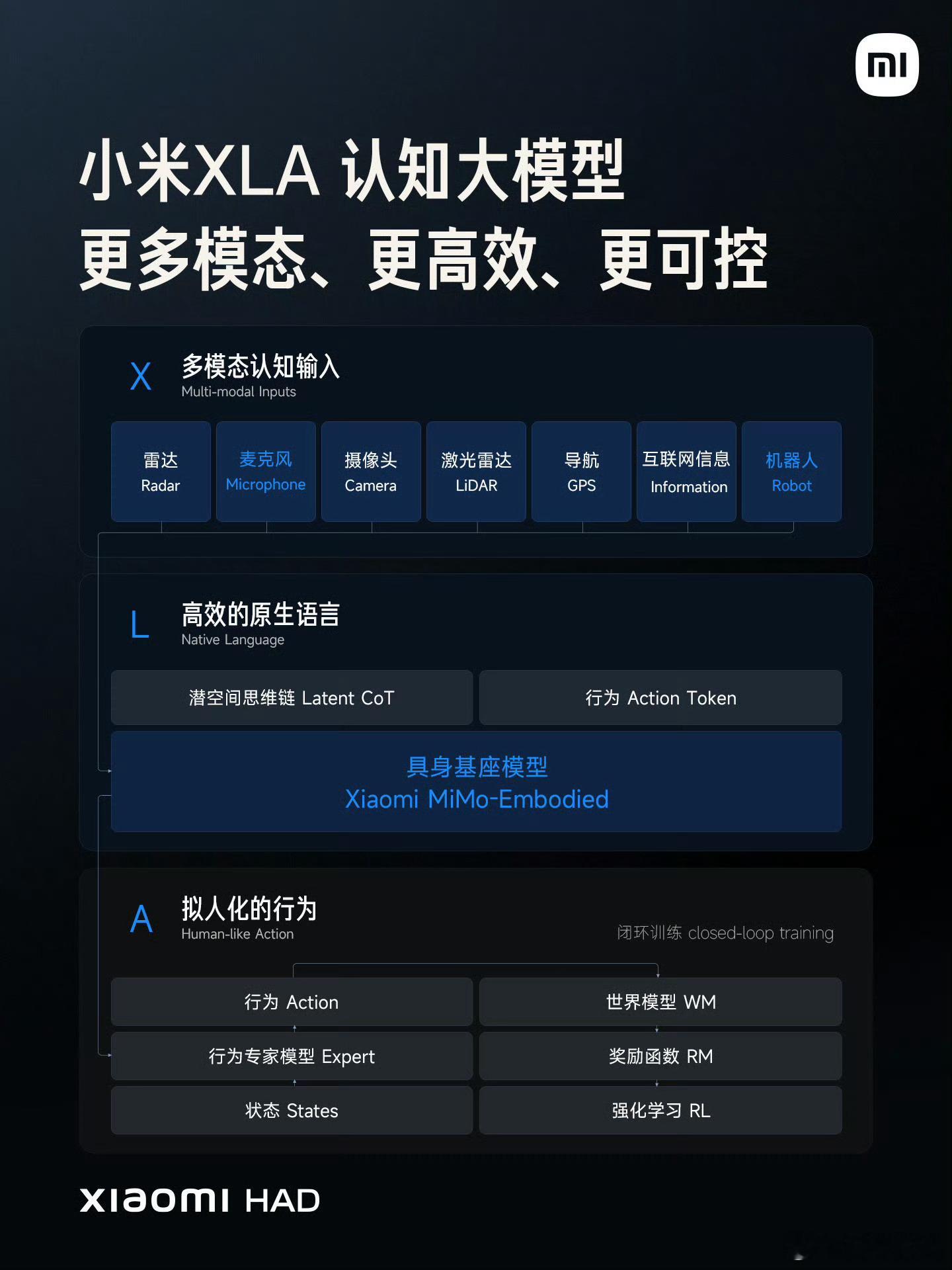 小米新SU7XLA大模型揭秘 一直觉得车就是个交通工具,跟机器人是两码事。但看到小米新SU7搞出来的这个XLA大模型,是把这两件事给揉一块了。小米自研的MiMo-Embodied,简单讲就是让辅助驾驶和具身机器人共用了一个大脑。过去很多车厂搞智驾,遇到点没见过的复杂路况就容易发懵,因为底层逻辑还是在套死公式。现在小米等于让系统有了点咱们人类的常识。平时开车,早晚高峰随便遇到个突然变道或者非机动车乱窜,光靠机器算距离根本不够用。小米这次把智能驾驶和机器人的底层逻辑打通,算是在行业里开了个头。以后的辅助驾驶,估计会越来越像个长了眼睛和脑子的老司机。 车是最先落地的具身智能
