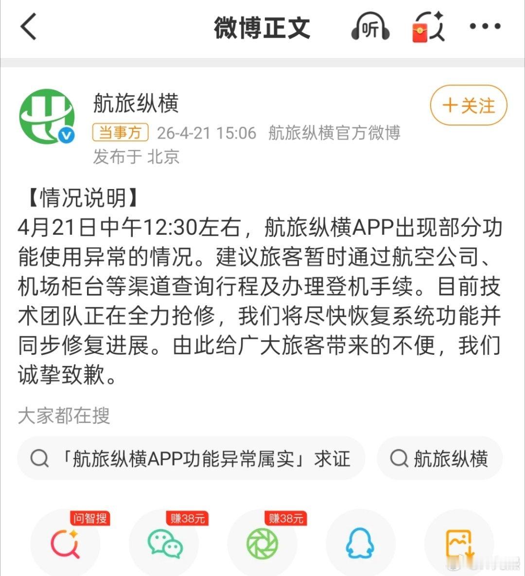 说了等于没说只希望今天能修复好吧,因为我是明天的航班。航旅纵横回应系统崩了