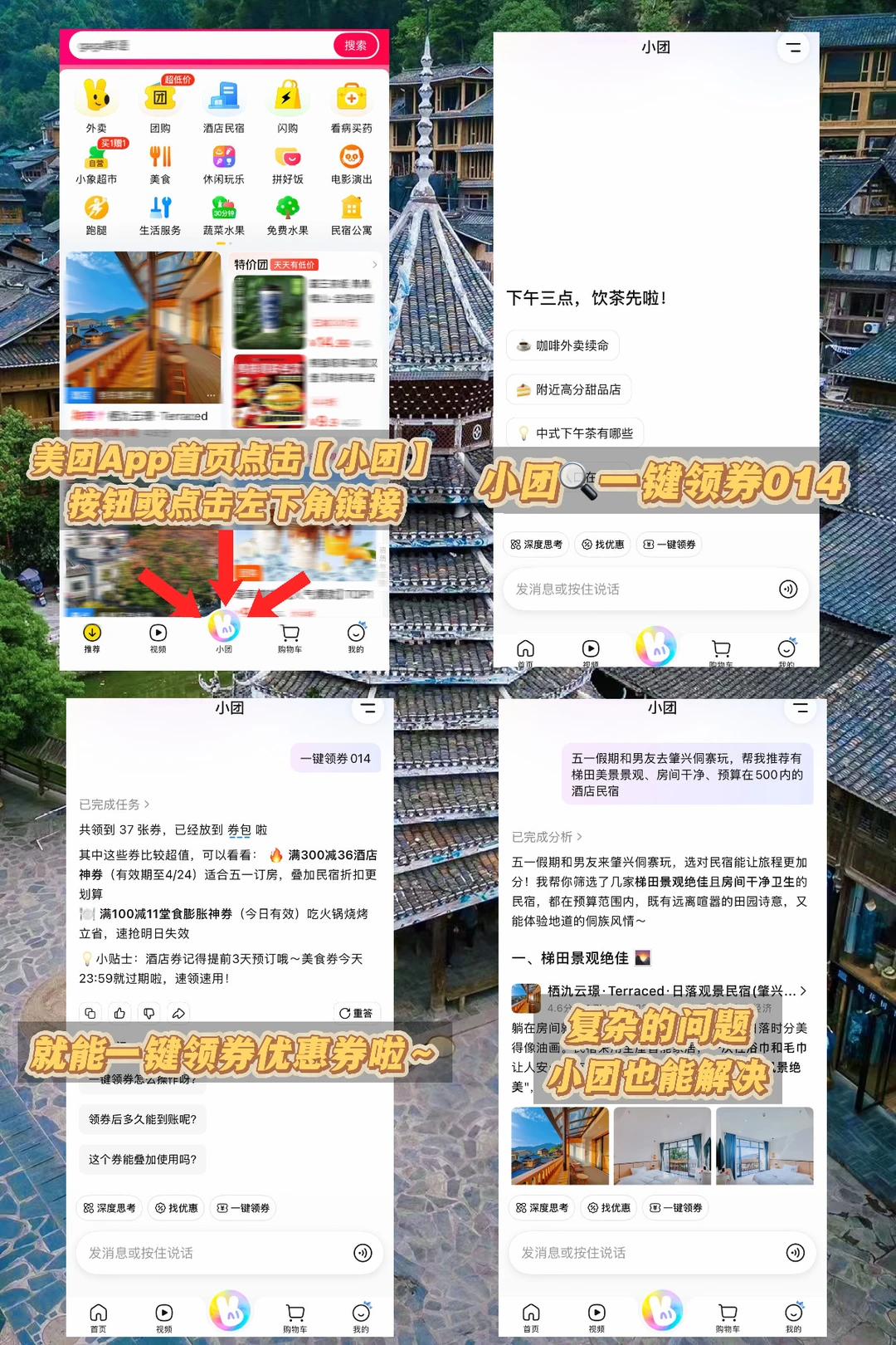 别人五一花了三周研究省钱,你只需要点击左下角链接或上美团 App,找到下方的小团按钮,🔍【一键领券014】小团5秒安排到位❗不再当乱花钱侠,把预算扔给小团,你只管出发🚗