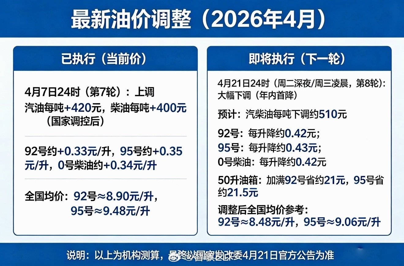 📢今晚24时,油价要降了!车主们再坚持一下,今晚(4月21日)过后再去加