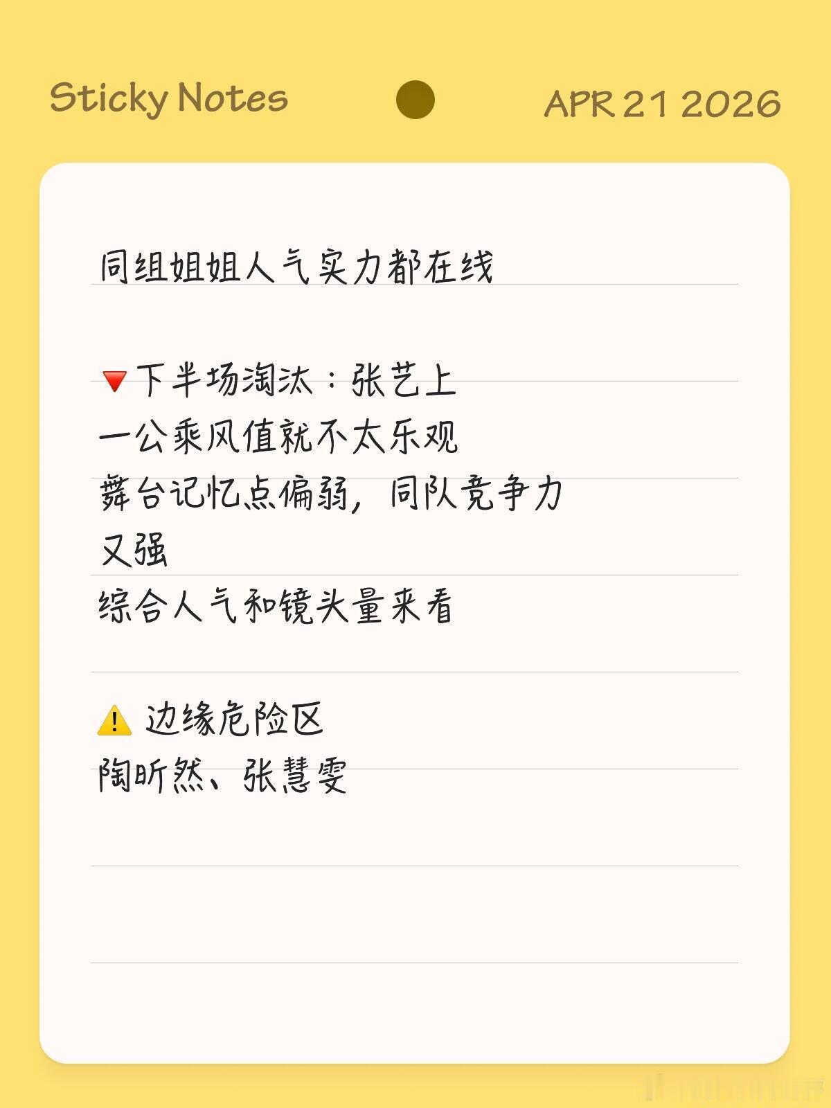 🔻下半场淘汰:张艺上一公乘风值就不太乐观舞台记忆点偏弱,同队竞争力又强综合人气和镜头量来看