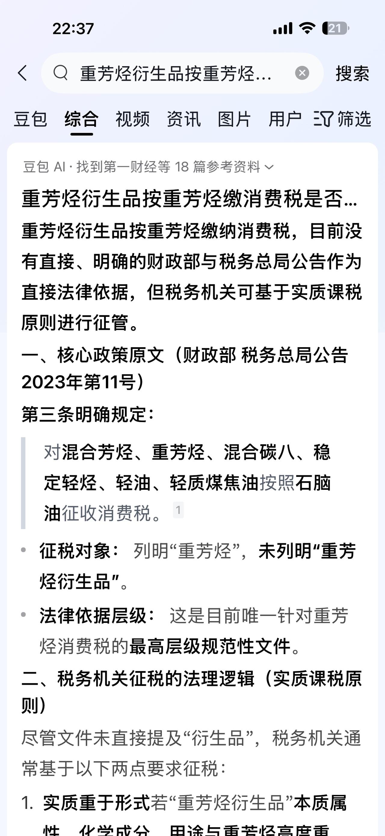原因也很简单:重芳烃衍生品是否按重芳烃缴消费税?我查了一下,国家税务机关确实没有相关规定!财政部、国家税务总局2023年11号文,明确了重芳烃要缴消费税、而没有列明重芳烃衍生物需要缴消费税!