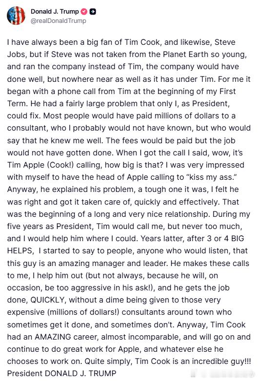 总之,蒂姆·库克拥有一段令人惊叹、几乎难以比拟的职业生涯,并且他会继续为苹果以及他未来选择从事的任何事业做出卓越贡献。简单来说,蒂姆·库克是个非常了不起的人!!!