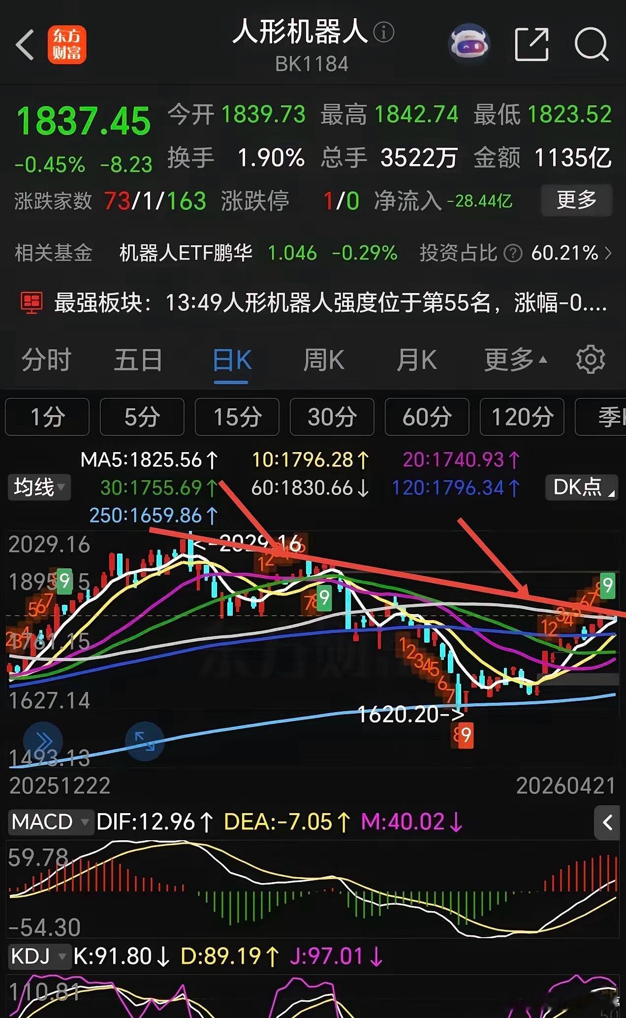 创新药、人形机器人双双面临回调压力。创新药此前突破下行趋势,如今重回压力区间,盘中跌破20日线,下方30、60日线支撑较近,回踩空间有限,可观望或低吸。人形机器人来到60日线及下降趋势线压力位,上冲成功则继续走强,否则短期回调。多条均线向上,回调空间不大,上涨概率更高,建议持股观望,暂不加仓。以上仅为个人观点,不构成投资建议!