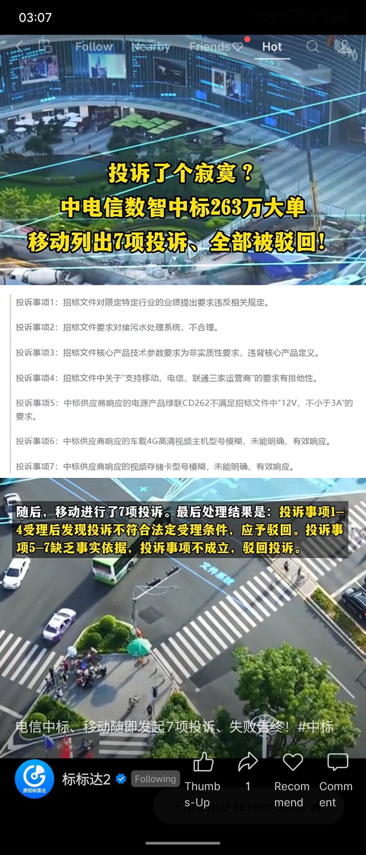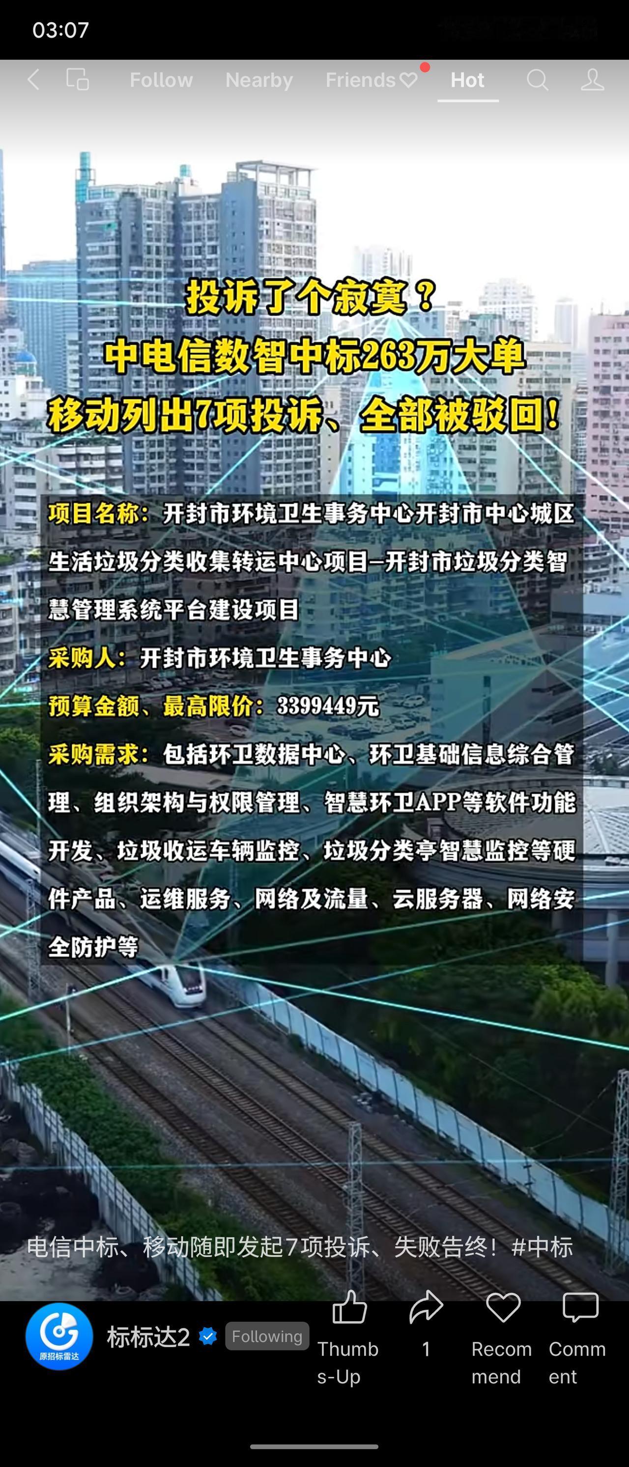 河南开封垃圾分类智慧管理系统项目,预算339.9万元,中电信数智以263万元中标。竞标对手中国移动提出7项投诉,指控招标文件违规、参数排他、产品响应模糊等。最终投诉全部被驳回:前4项不符合受理条件,后3项缺乏事实依据。