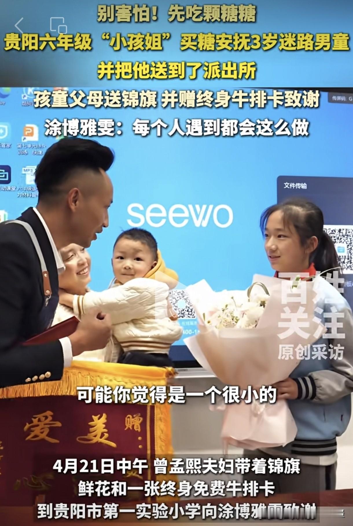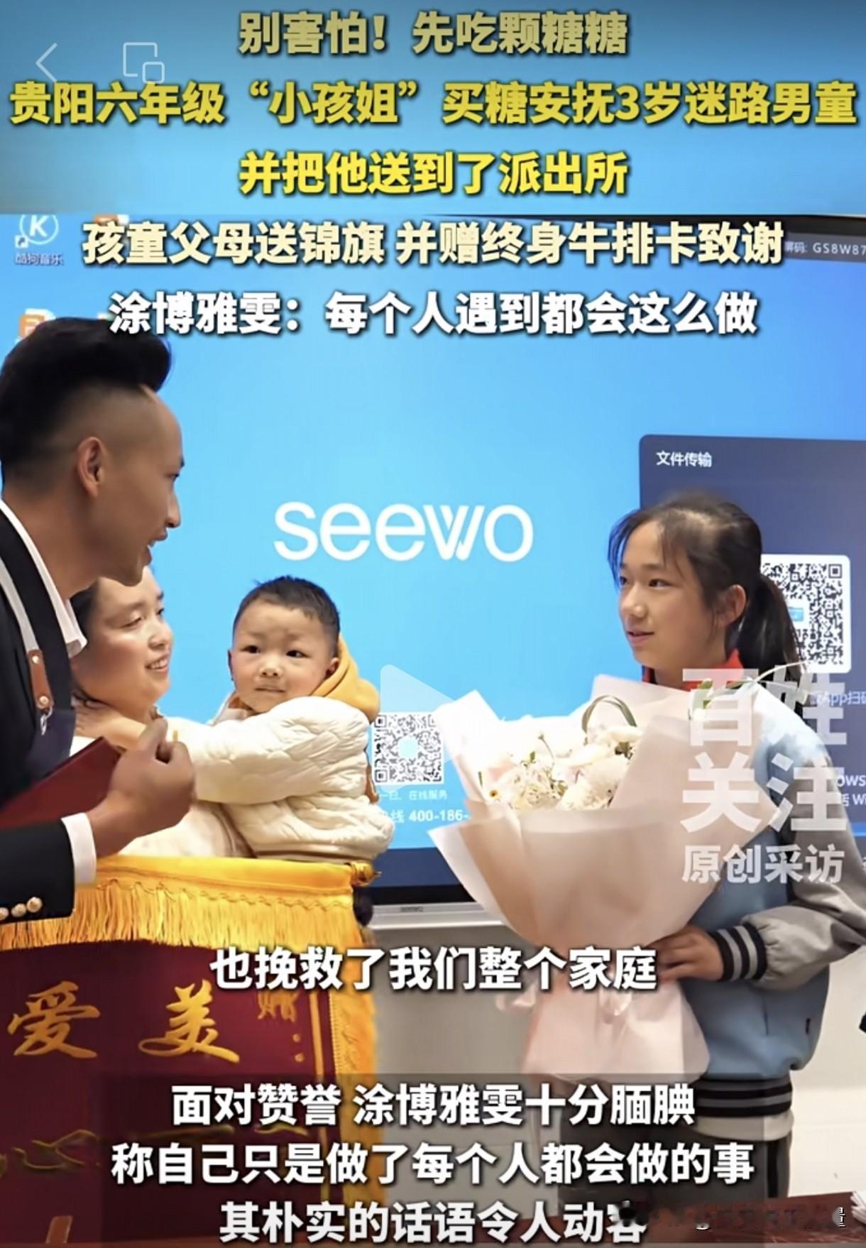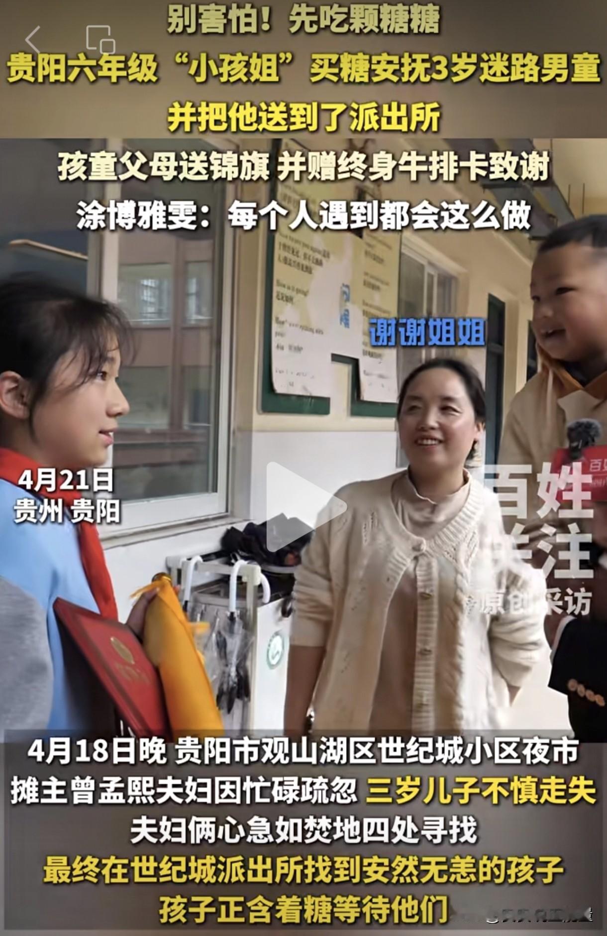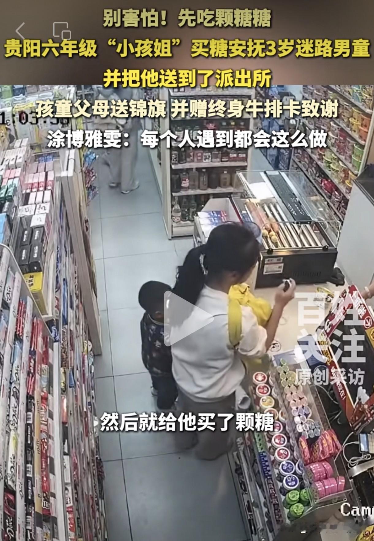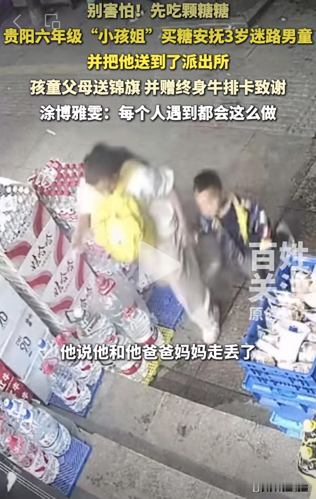 原来小女孩在上学路上发现一名男童在商店门口大哭,一问才知道他跟家人走散了。于是她带着男童走进商店买了一根棒棒糖来安抚男童情绪,然后报警求助。把男童交给警察叔叔后,她就放心去上学了。男童最后也顺利回到了爸爸妈妈的怀抱里面。