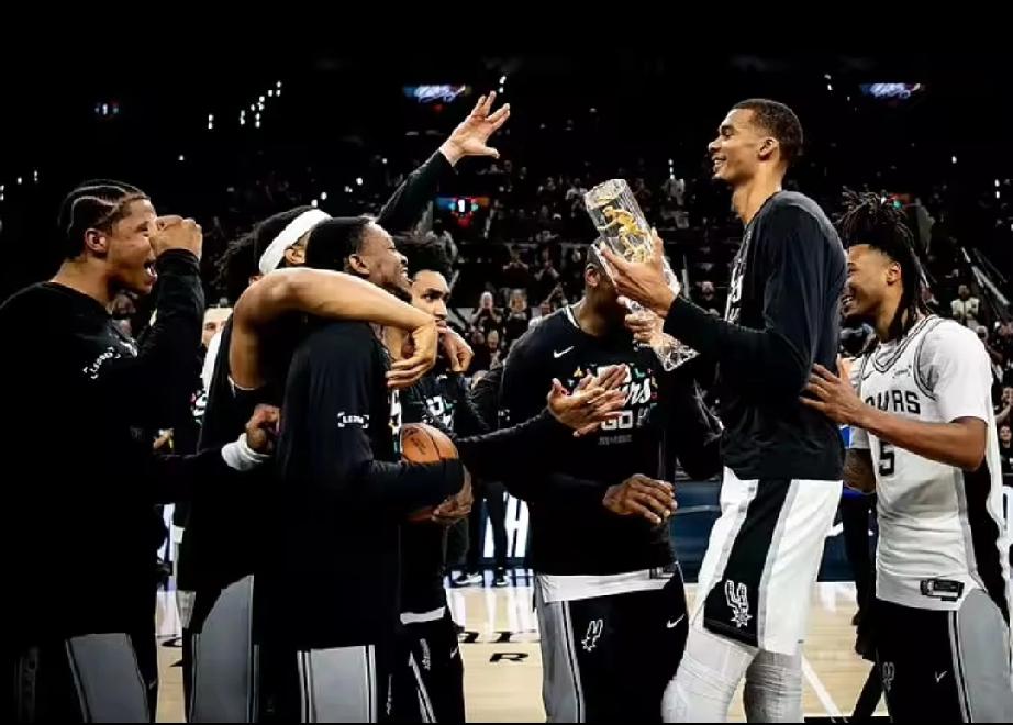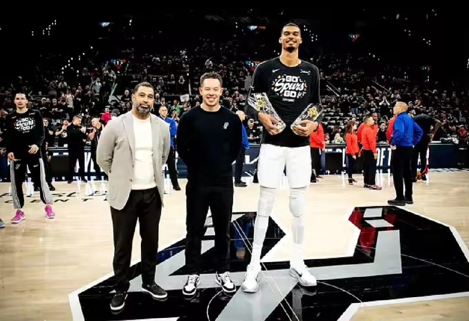 马刺社交媒体晒照,文班在赛前领取了最佳防守球员的奖杯,主教练以及队友们和他一起庆祝。