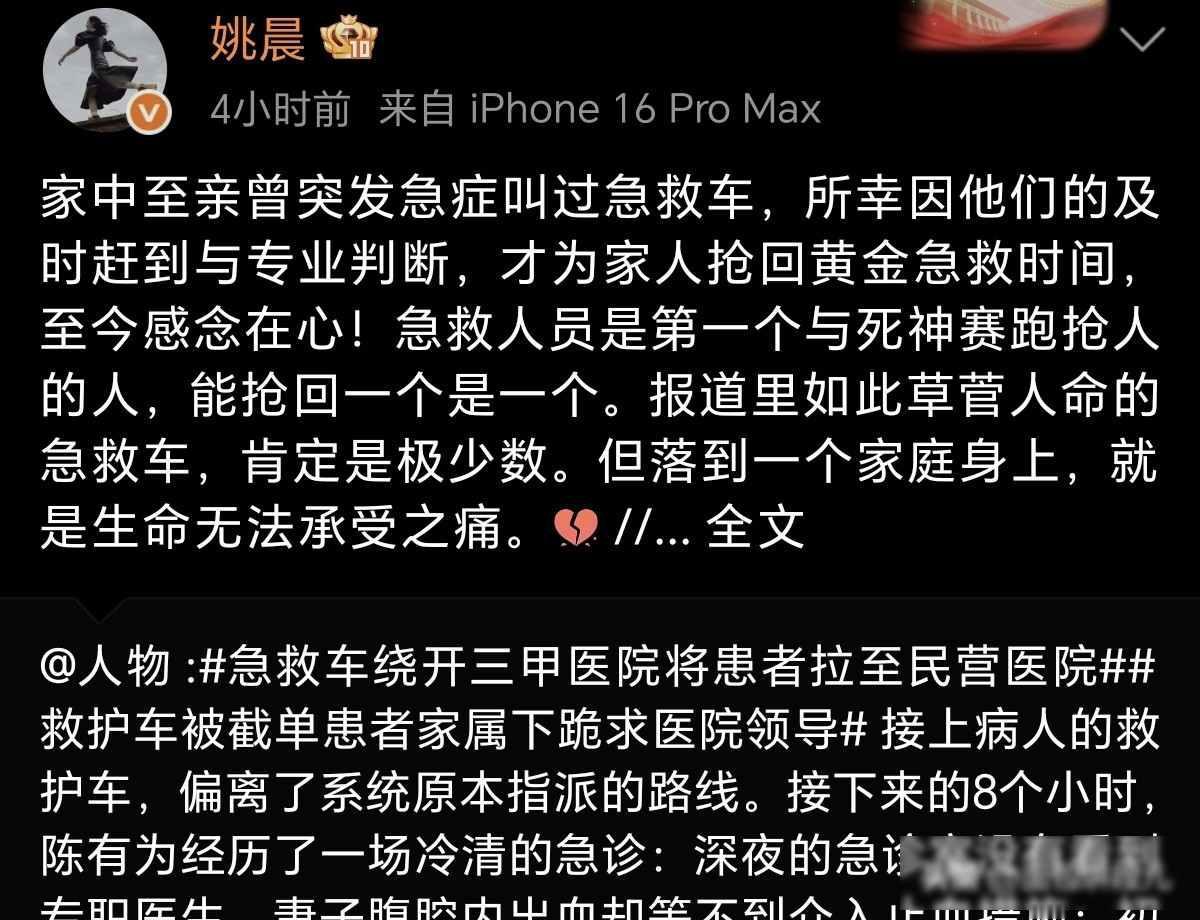 姚晨的两条动态,没有华丽的辞藻,没有激烈的谩骂,一条简单陈述事实,写下“一条命用了八小时,没有送到最近的医院”,另一条则直接怒斥涉事医院和急救车“草菅人命”。
