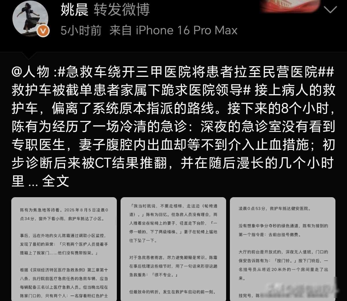 可现实却给了这个家庭最沉重的一击,赶来的急救车没有驶向最近的公立医院,反而绕了3.8公里的路,径直将她送到了一家民营医院。