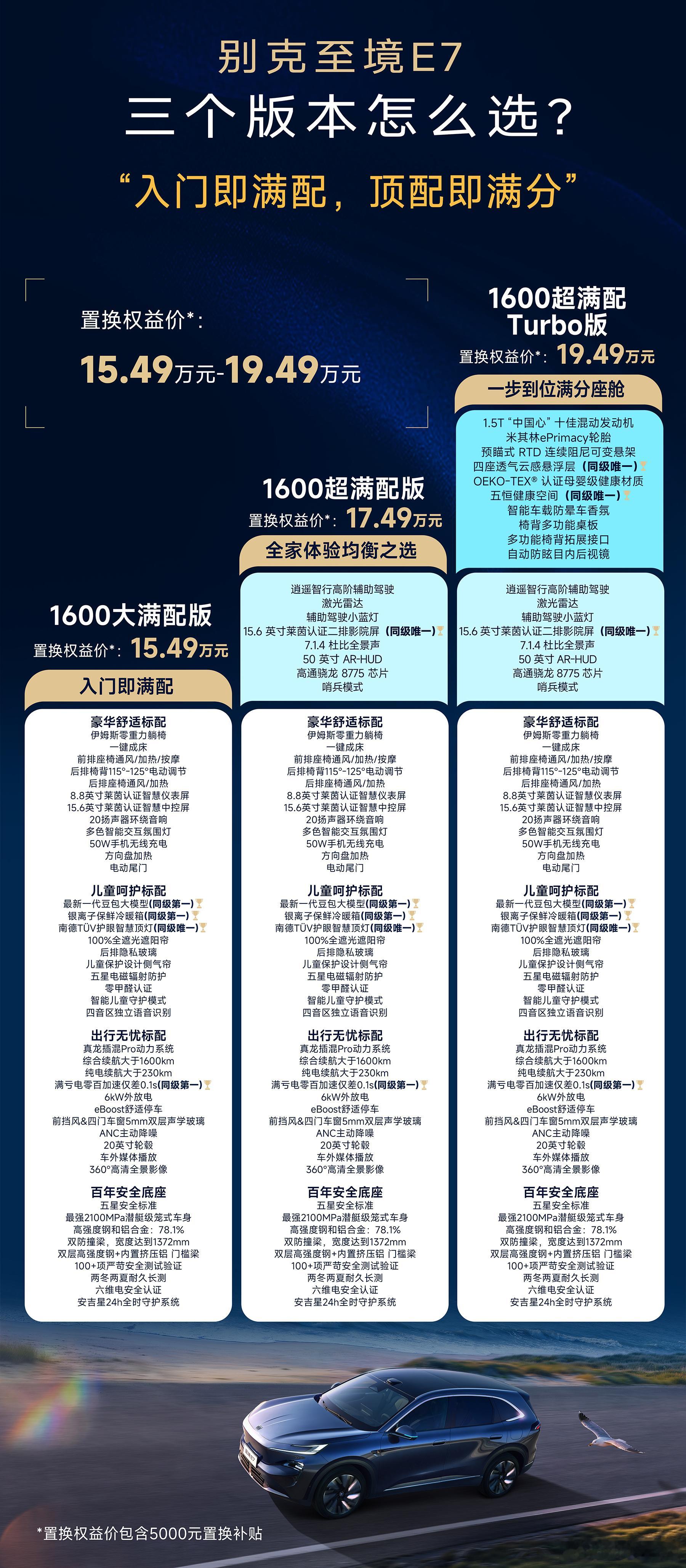 别克至境E7官方指导价15.99万-19.99万元,置换补贴5000-7000,置换叠加上基本可以做到15.49万-19.49万元,从业群都说价格到位了。产品思路简单直接,标配足够家用,高配增加科技体验,对用户来说最顾虑的两点一个价格一个选配置都不用纠结。