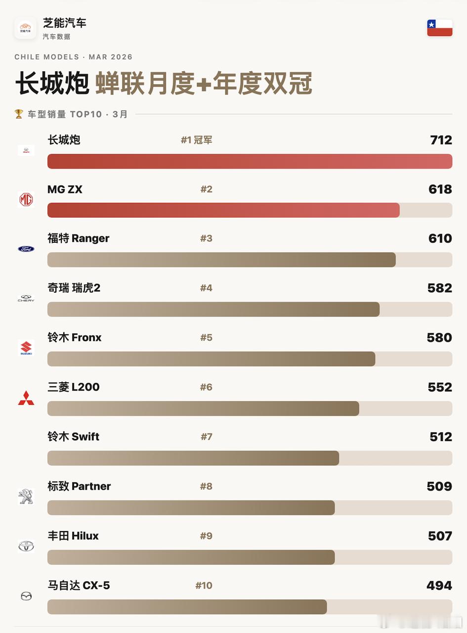 ◎ 第一名依然是长城炮:3月712辆,同比增长38.5%,2026年累计2,171辆(+30.8%),同时也是年内第一,“高性价比皮卡”在智利仍是刚需;