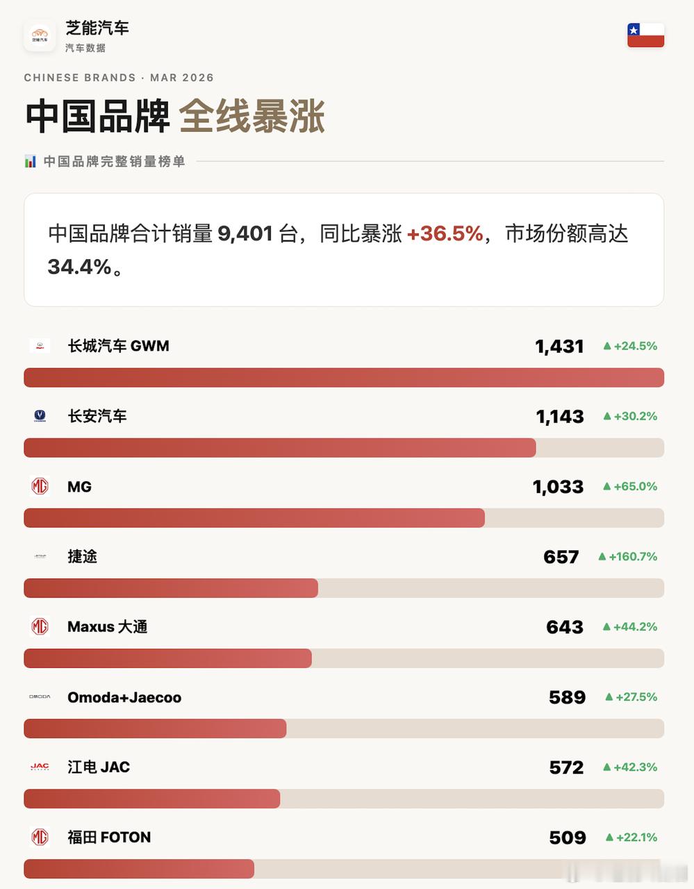 3月,智利轻型车销量27,358辆,同比增长14%;2026年一季度累计74,977辆,同比增长5.8%。中国品牌整体份额达到34.4%,单月9,401辆,同比增长36.5%。