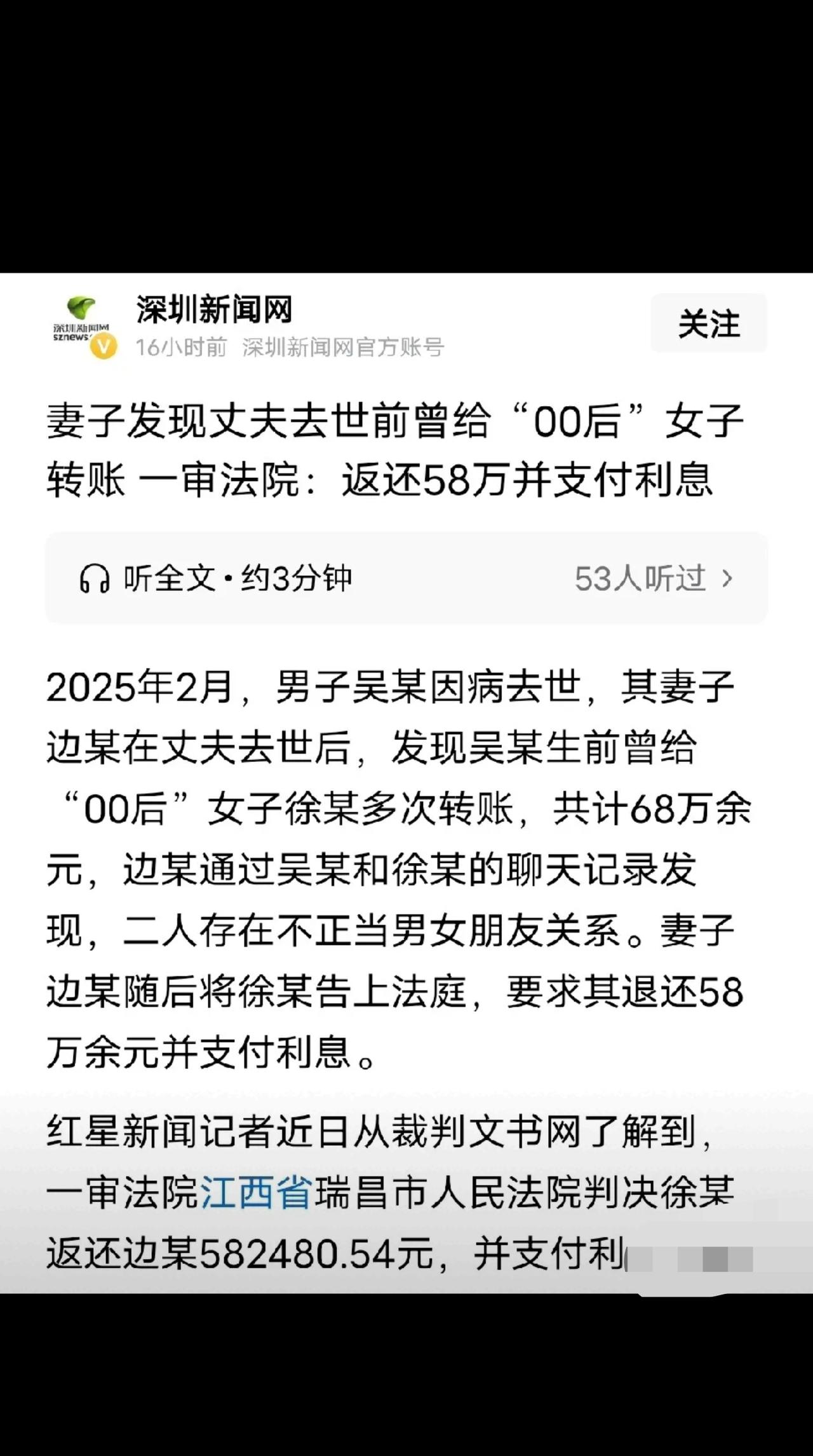 江西瑞昌,妻子收拾丈夫遗物时,发现他在4年间给一00后女子转账68万,备注:宝贝爱你。妻子认为二人有不正当关系,反手将女子告上法院,要求还钱并支付利息,法院判决亮了!