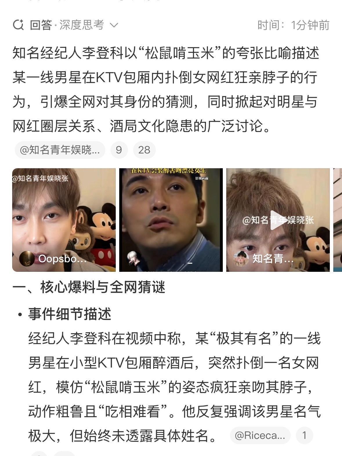 曝男明星KTV亲女网红我现在就一个态度:要么别爆,要么爆名字。天天“某一线男星”“极其有名”,大家全在猜,最后大概率又是不了了之。你说他是炒作吧,还真有人信;你说他真爆料吧,连张糊图都没有。