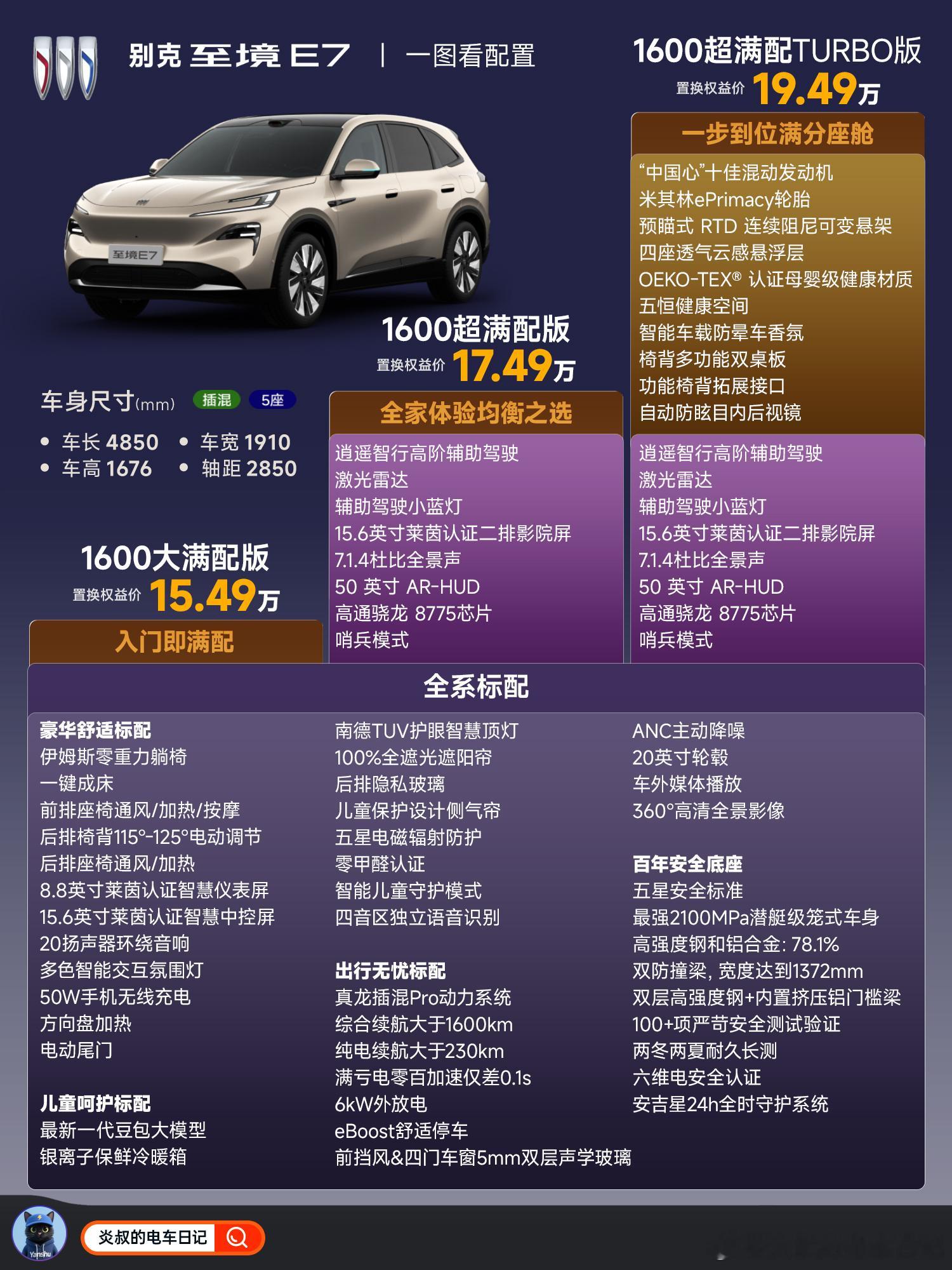 今晚上市的别克至境E7火成了“带娃神车”!目前预售阶段小订已经冲破3万台,有意思的是,下单的人里居然有85%以上都是家里有娃的。为什么这些理性的爸妈偏偏被别克“拿捏”了?✨ 三款配置 至境E7拒绝“入门即低配”套路1️⃣ 1600大满配版:燃油转电首选。标配了包括零重力座椅、一键成床、银离子冷暖箱、护眼智慧顶灯及豆包大模型在内的42项核心配置,起步即享高品质体验感2️⃣ 1600超满配版:科技派家庭必入。在大满配版基础上增加了高阶辅助驾驶系统与莱茵认证二排影院屏,实现了智能与舒适的均衡 3️⃣ 1600超满配Turbo版:极致党一步到位。在超满配版基础上升级了预瞄式RTD、四座云感悬浮层座椅及母婴级材质座椅,无短板的六边形战士🤖 智能化至境E7首发搭载新一代豆包大模型,化身能与孩子互动、提供情绪价值的“数字家人”。在驾驶辅助上,搭载Momenta R6强化学习大模型,能丝滑泊入包括断头路、机械车位在内的各种极限车位,以及车位到车位/高快/城区的领航驾驶辅助,降低家长的驾驶焦虑 🚗 动力与续航至境E7搭载真龙插混Pro系统,综合/纯电续航里程,至高达1630km/235km。具有 “满亏电一条龙” 的优势,在亏电状态下,百公里加速差异仅0.1s,亏电油耗低至5.32L。而且高速巡航性能稳定,1.5L(Super)与1.5T两种动力均能提供超越传统2.0T燃油车的驾控体验
