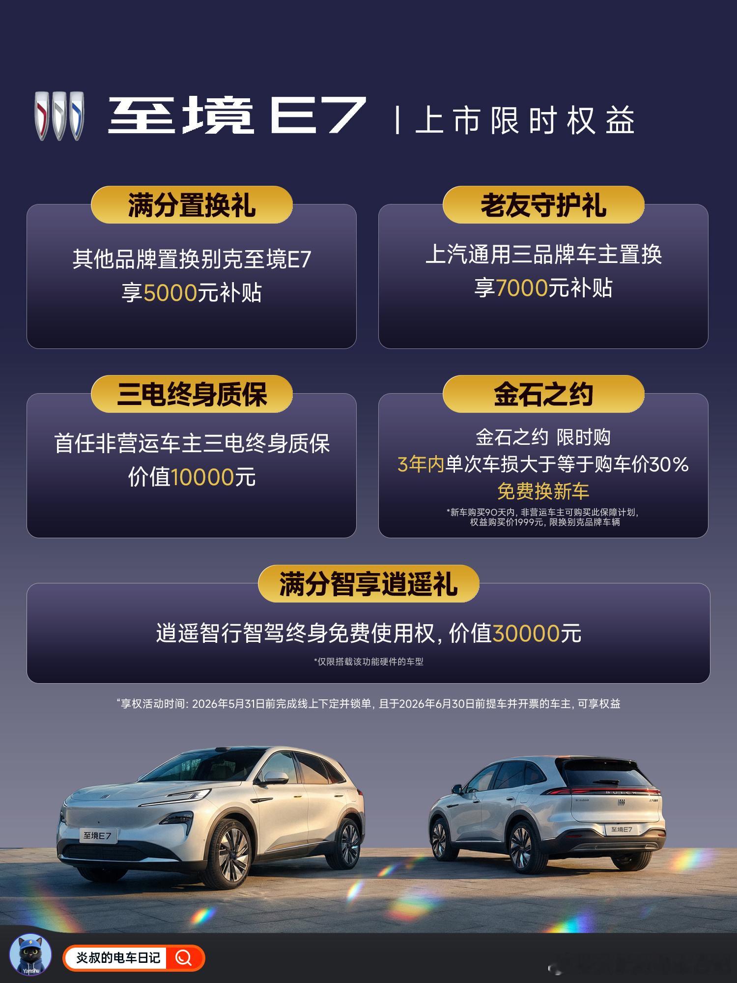 🛒 上市价格别克至境E7 置换权益价1600大满配版15,49万元 1600超满配版17,49万元 1600超满配Turbo版19,49万元即日起下定并提车的用户,还可享受5000元/台置换补贴、上汽通用三品牌老车主可以享7000元置换补贴、首任非运营车主三电终身质保、逍遥智行智驾终身免费使用权、购买了金石之约的车主3年内重大车损免费换新。