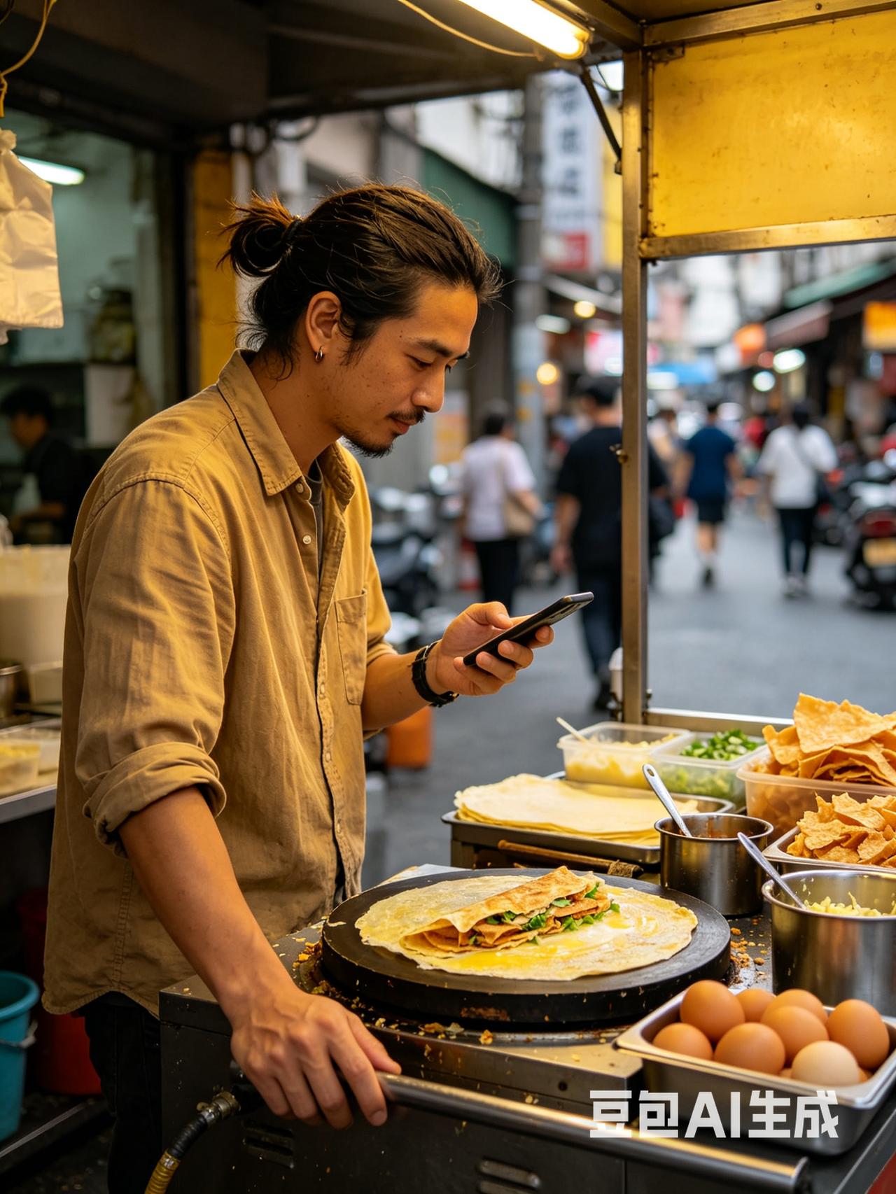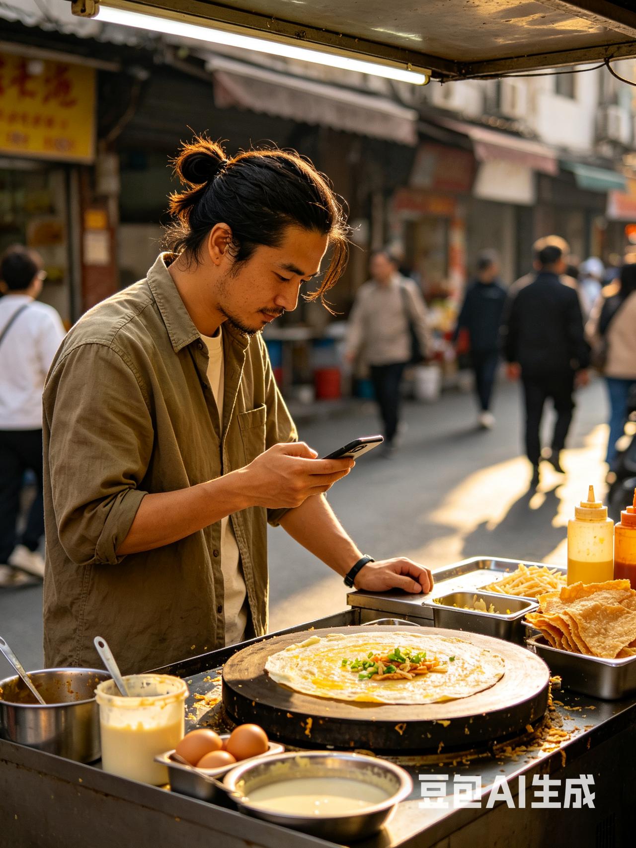 卖煎饼果子是一个文艺青年,他在摊煎饼过程中,两次拿起手机不停翻看东西,也不洗手,就又用去手拿其他的食物放到了煎饼果子上。