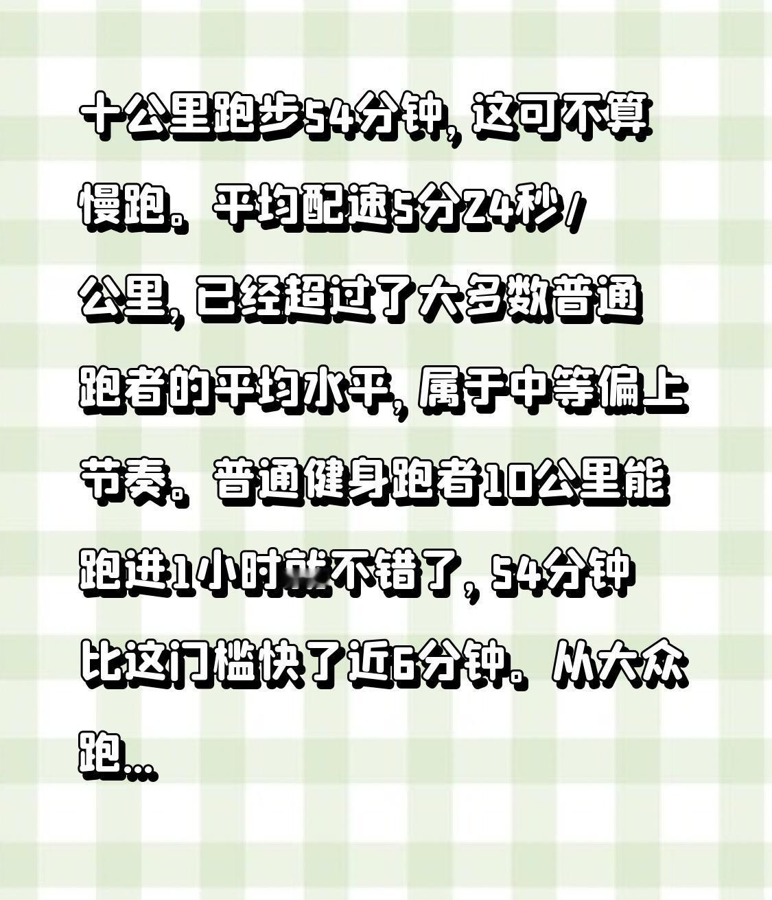 十公里跑步54分钟,这可不算慢跑。平均配速5分24秒/公里,已经超过了大多数普通跑者的平均水平,属于中等偏上节奏。普通健身跑者10公里能跑进1小时就不错了,54分钟比这门槛快了近6分钟。