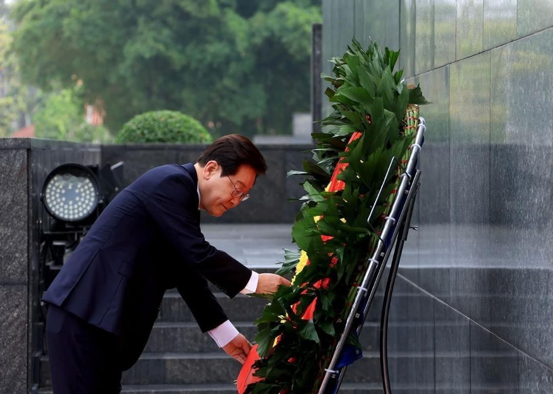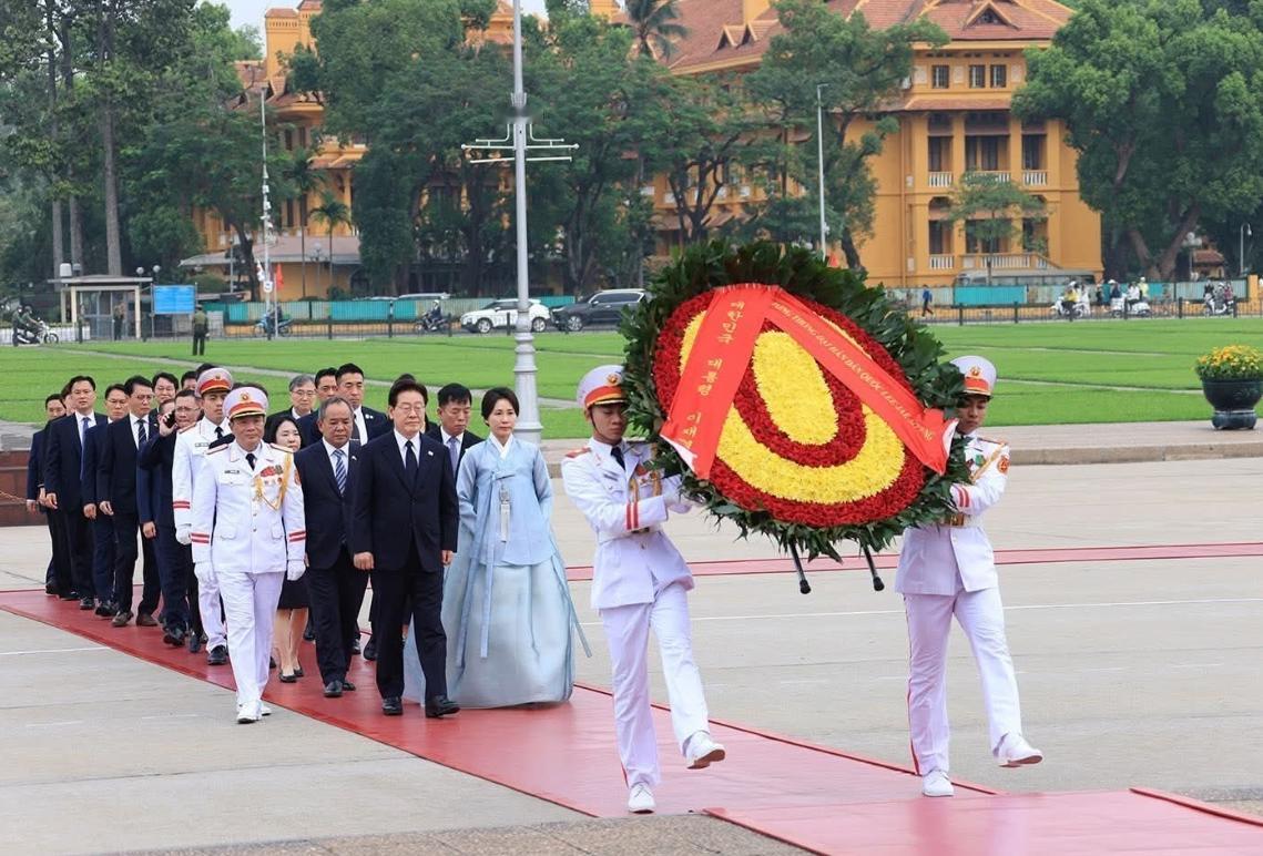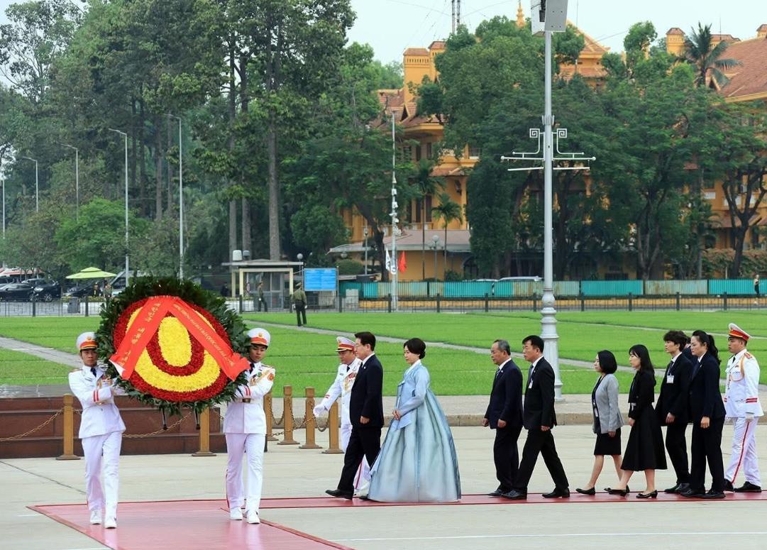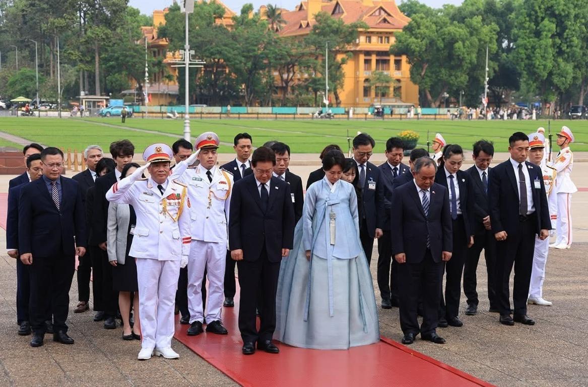 4月22日李在明前往胡志明陵敬献花圈,韩国第一夫人也来啦!让人没想到的是地面铺红