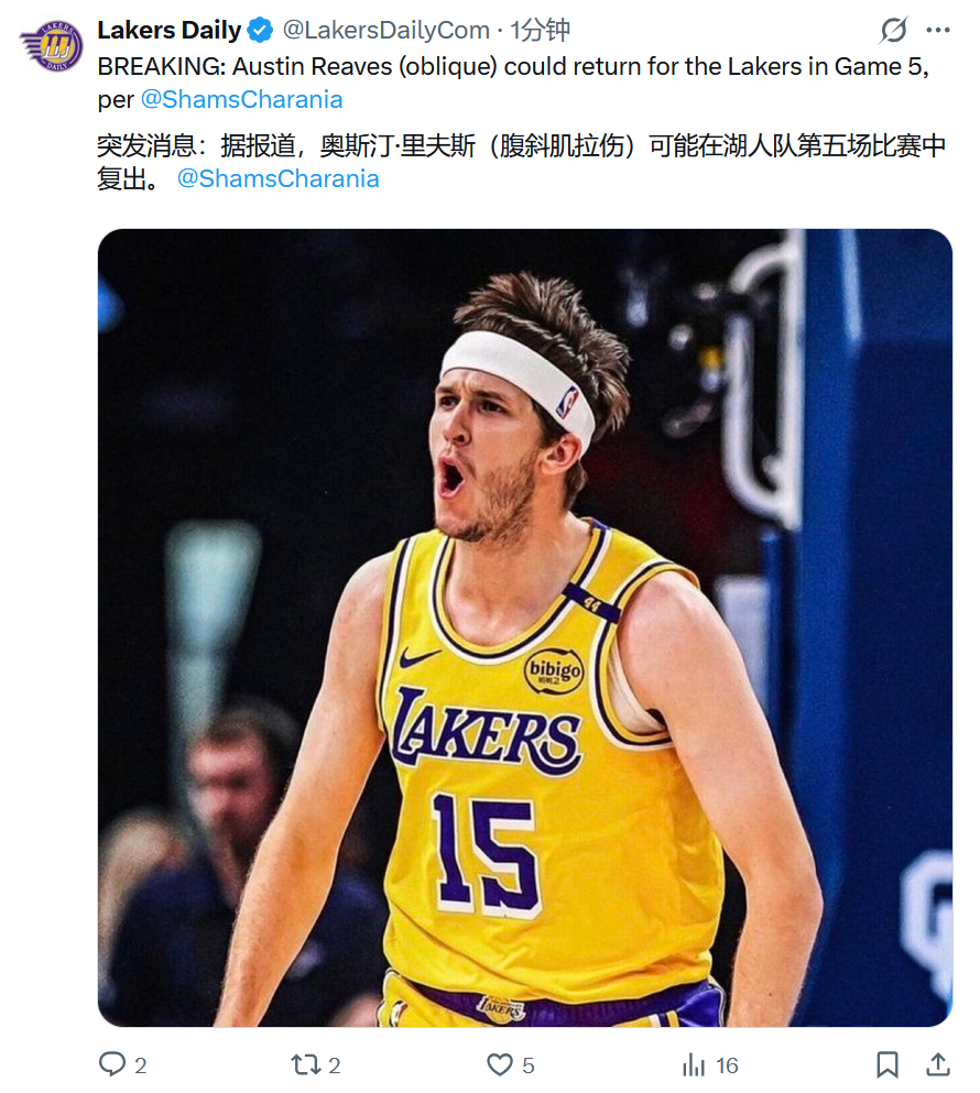 现在有消息说里夫斯可能G5复出。但是这个消息的第一来源其实不靠谱,并且没有视频佐证,他自己在评论区里提的是Shams在tk直播里说的,但是没有录屏。所以听听就得了~洛杉矶湖人