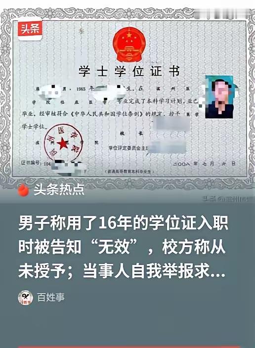 这事儿搁谁身上都得懵,一张用了十六年进过两家公立医院事业编制的学位证,突然就成了无效文件。烟台的展先生2008年从滨州医学院(现在叫山东医药大学)临床医学专业毕业,当年他因为一些纠纷背了个留校察看的处分,学校告诉他,学位暂时不发,等处分期满再看。