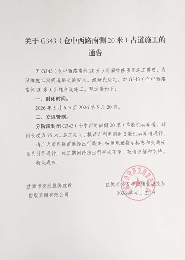 盐城最新施工占道通告!新业路高架地面道路(204国道至范公路段)将于5月6日至6月15日占道施工,封闭局部单股机动车道,车辆保留1股车道通行;G343仓中西路南侧路段将于5月6日至5月20日分阶段占道施工,封闭75米单股车道,车辆保留2股车道通行。交管部门提醒过往市民提前规划出行路线,遵照现场标识通行,并对施工带来的出行不便敬请市民谅解。