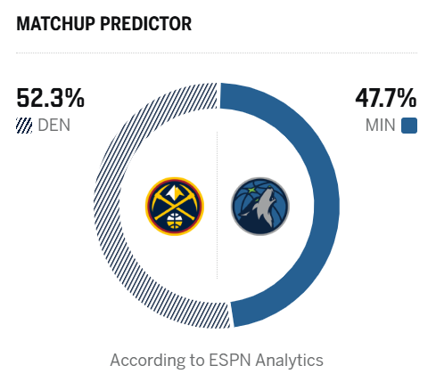 ESPN预测明日季后赛:掘金胜率52.3%,森林狼胜率47.7%