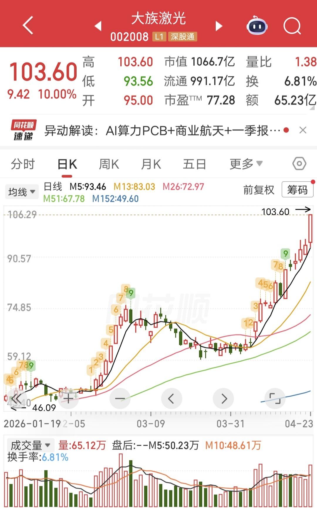 今天大族激光盘中涨停。