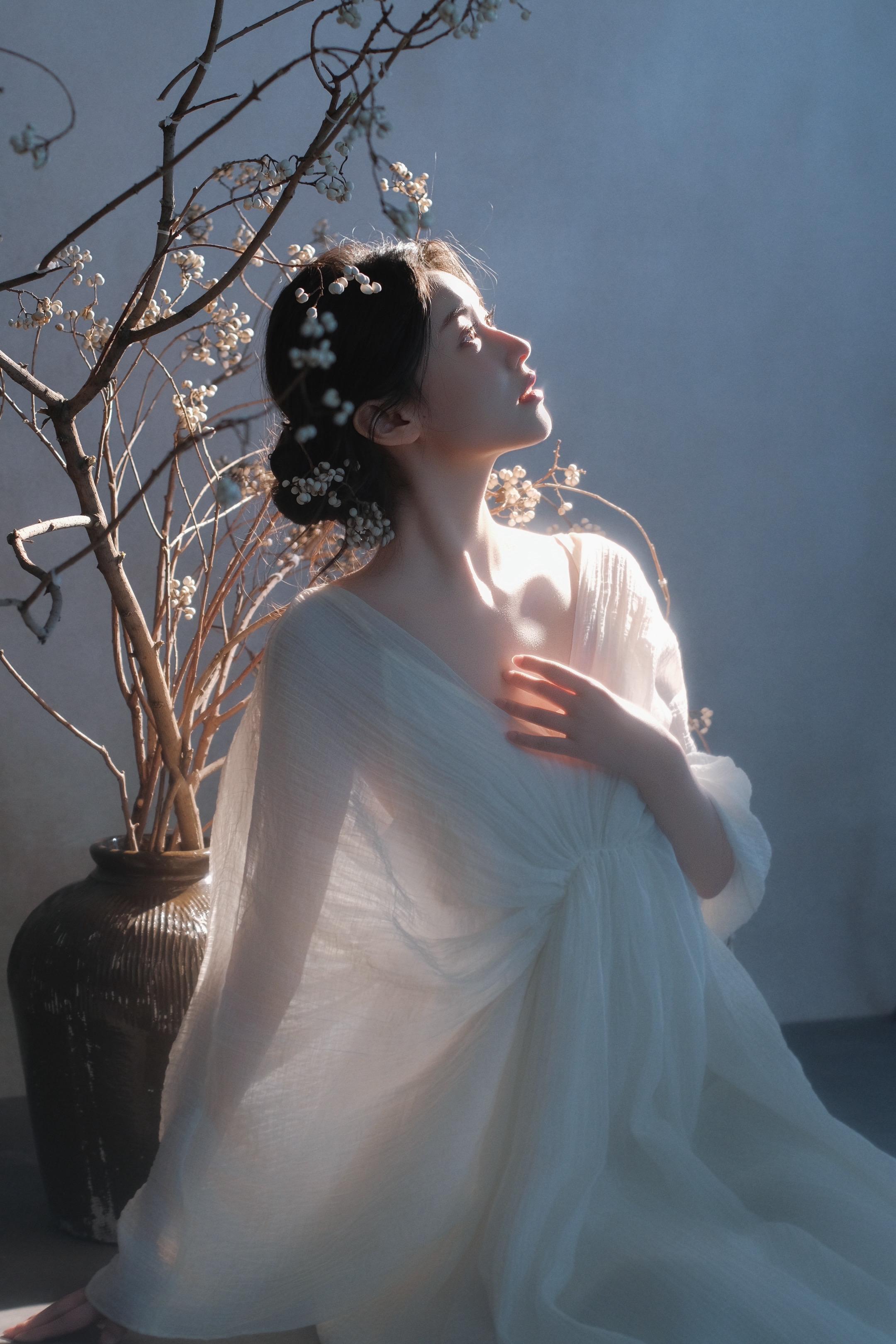 一在柔软的光影中,仿佛时间也放慢了脚步。一袭轻纱,几缕发丝,勾勒出一幅静谧的画卷