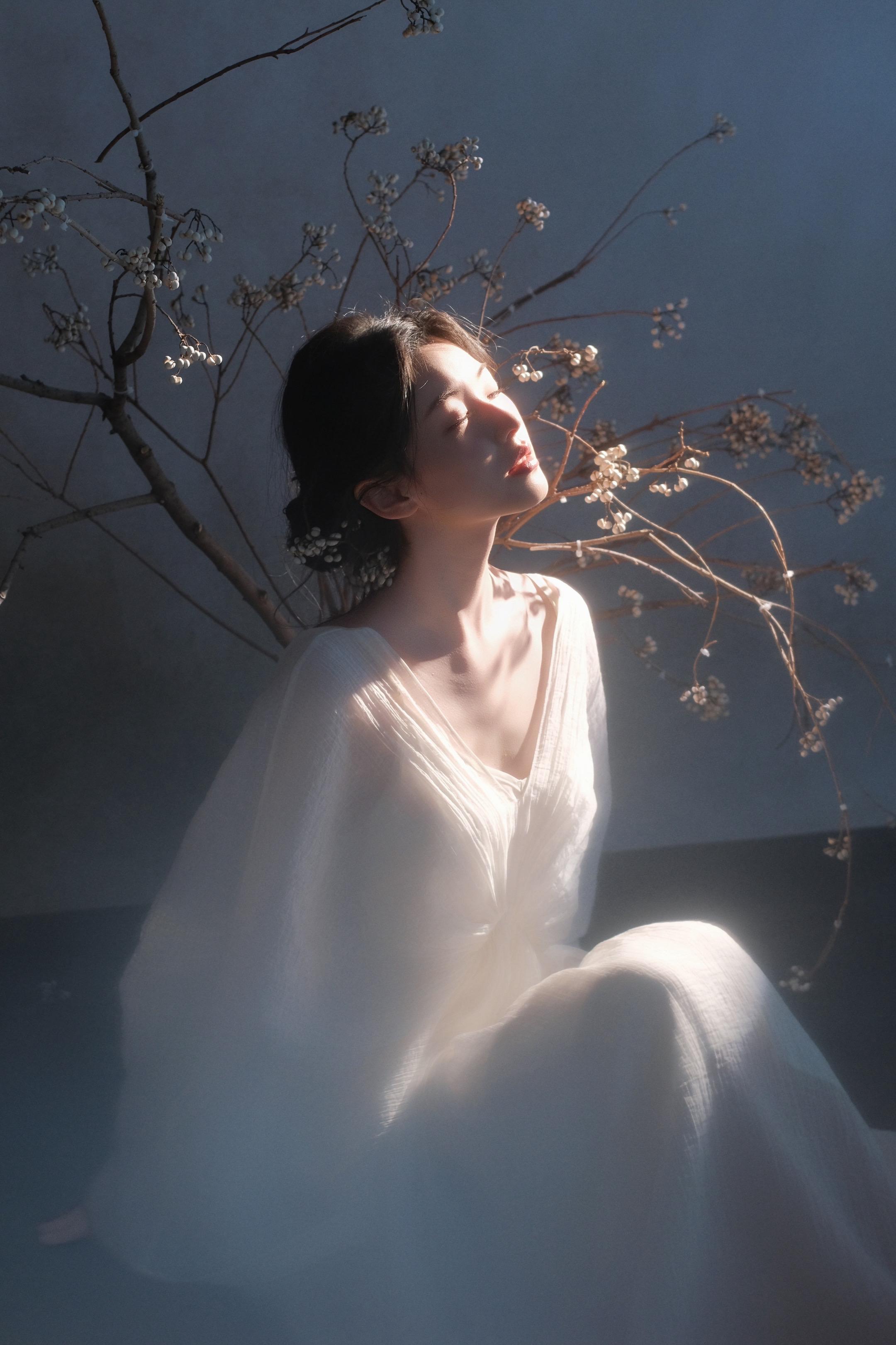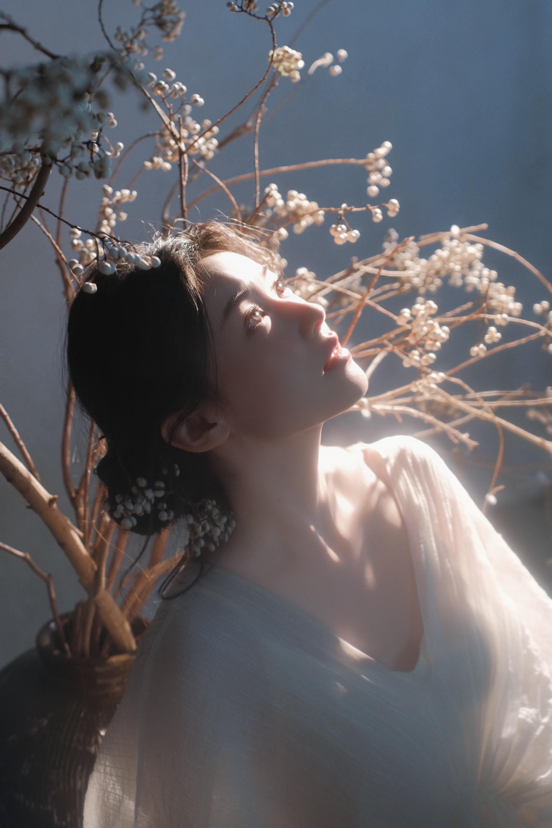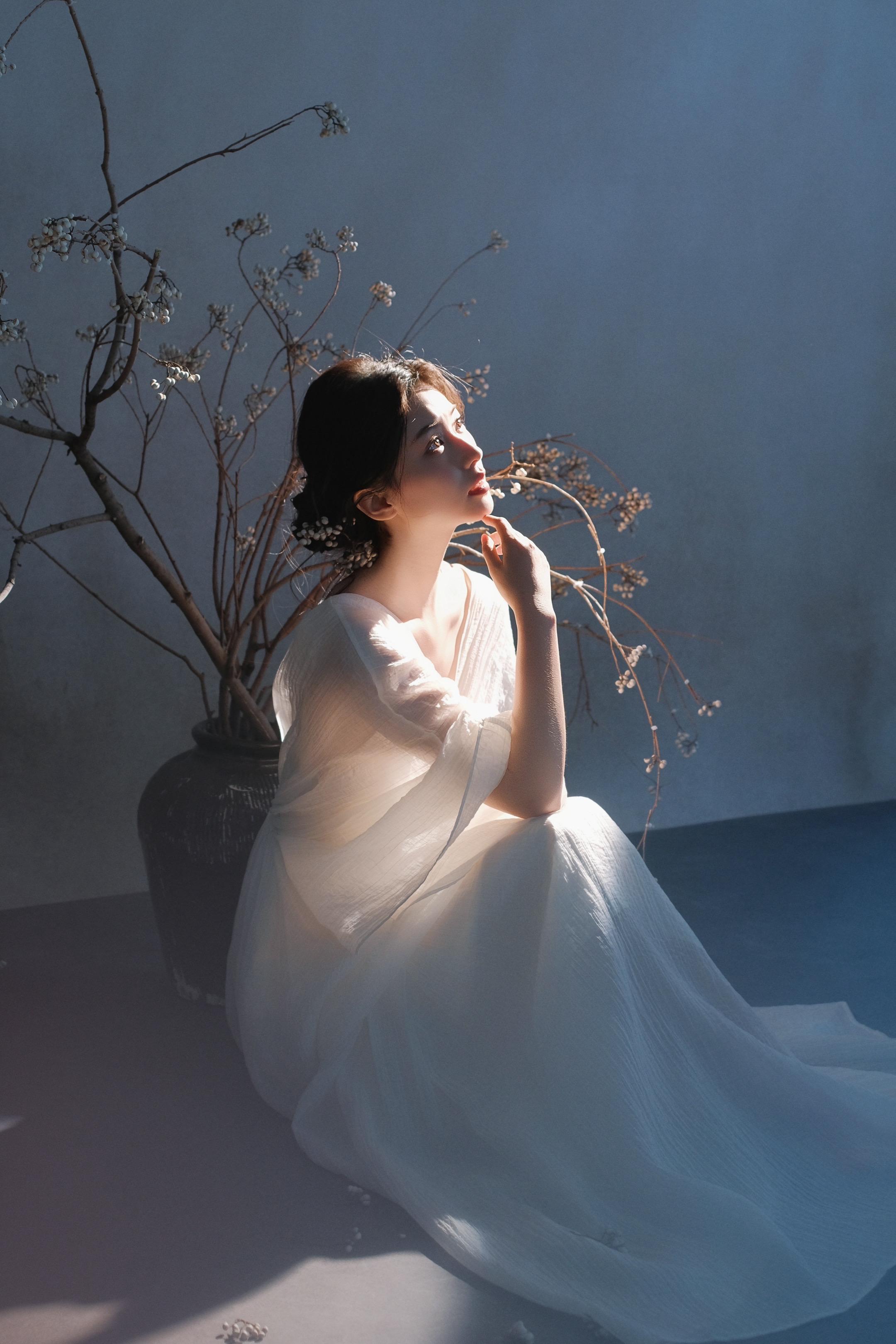 一袭白衣染风色,半是清冷半是温柔。光影掠过发梢,晕开独属于东方的松弛与诗意。素