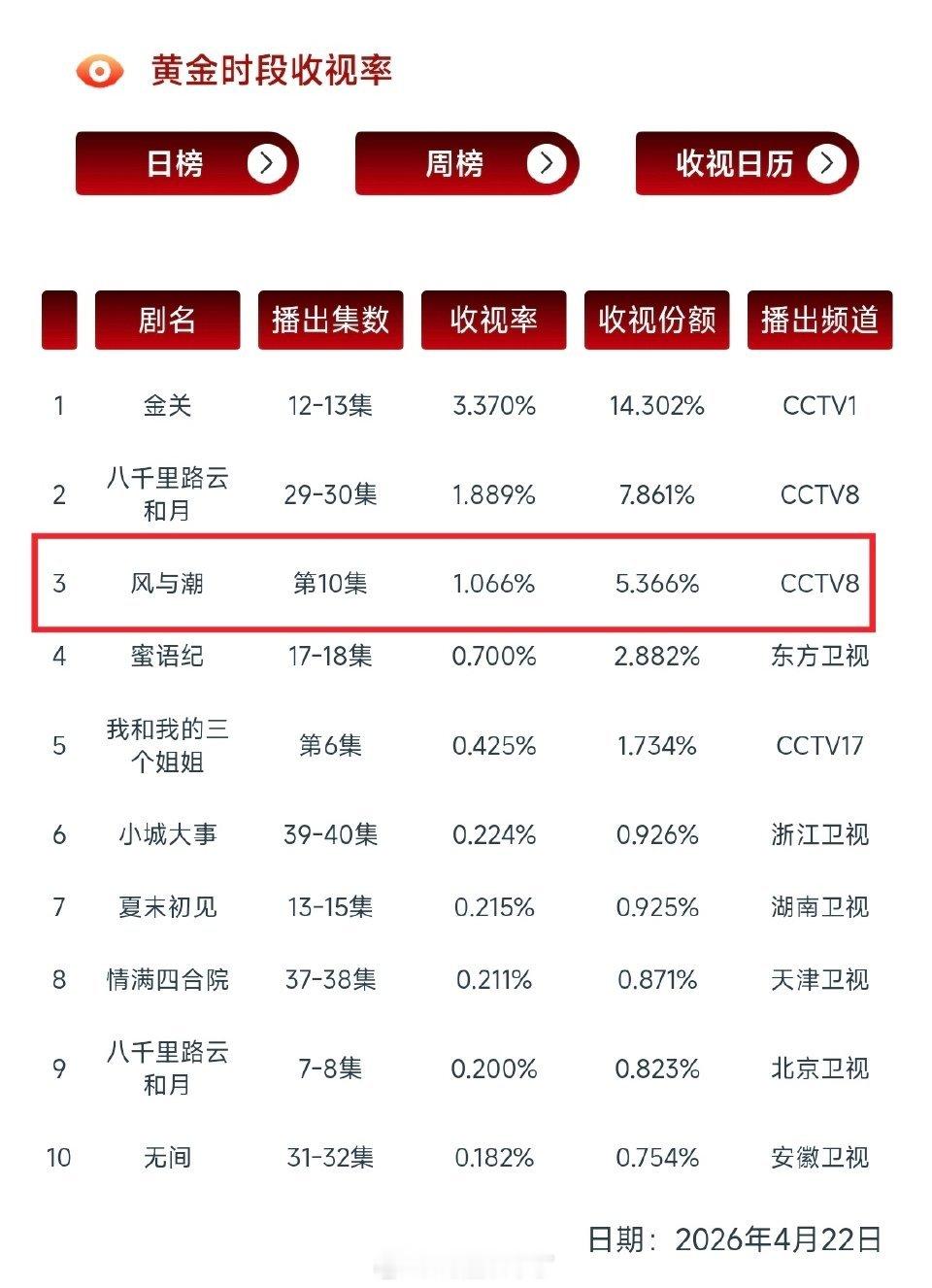 任嘉伦《风与潮》CVB又破1啦!自4月17日央八次黄档开播以来,每日黄金时段收视