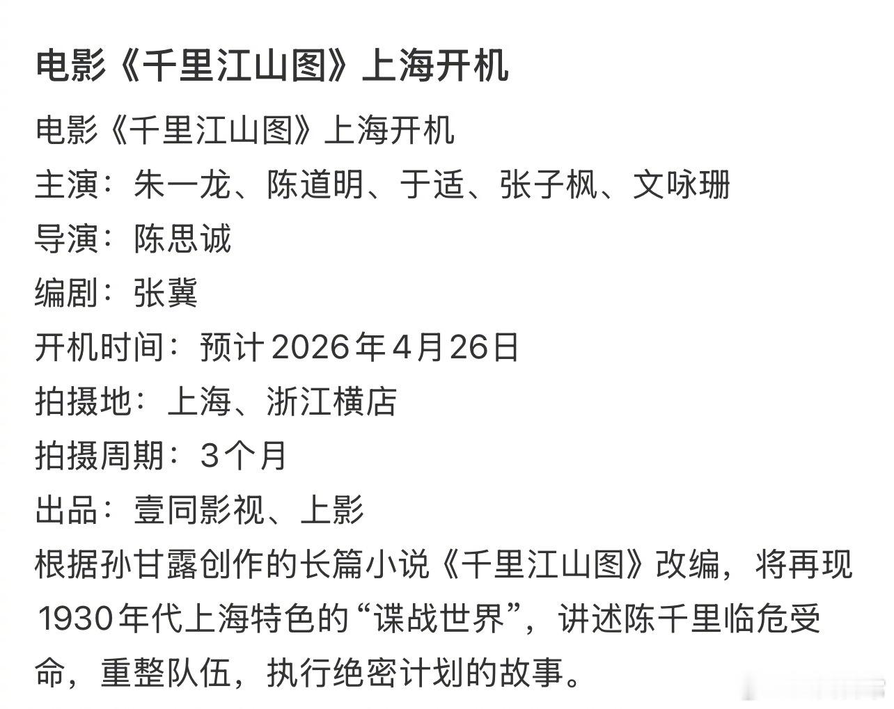 电影《千里江山图》即将开机主演:朱一龙、陈道明、于适、张子枫、文咏珊导演:陈思诚