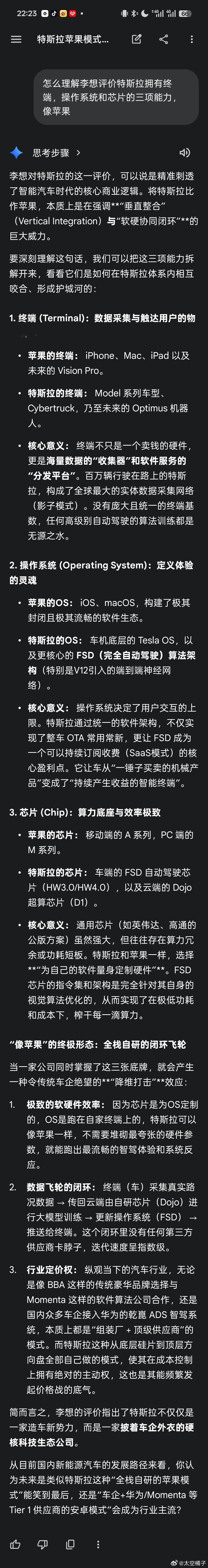 之前理想讨论特斯拉,拥有终端,操作系统和芯片的三项能力,像苹果公司