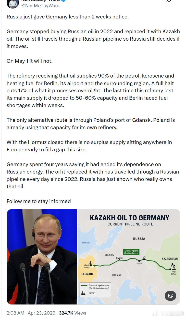 德国在过去四年一直宣称已经摆脱对俄罗斯能源的依赖,但其替代石油自2022年以来每天仍通过俄罗斯管道运输。俄罗斯刚刚展示了这些石油真正的控制权。