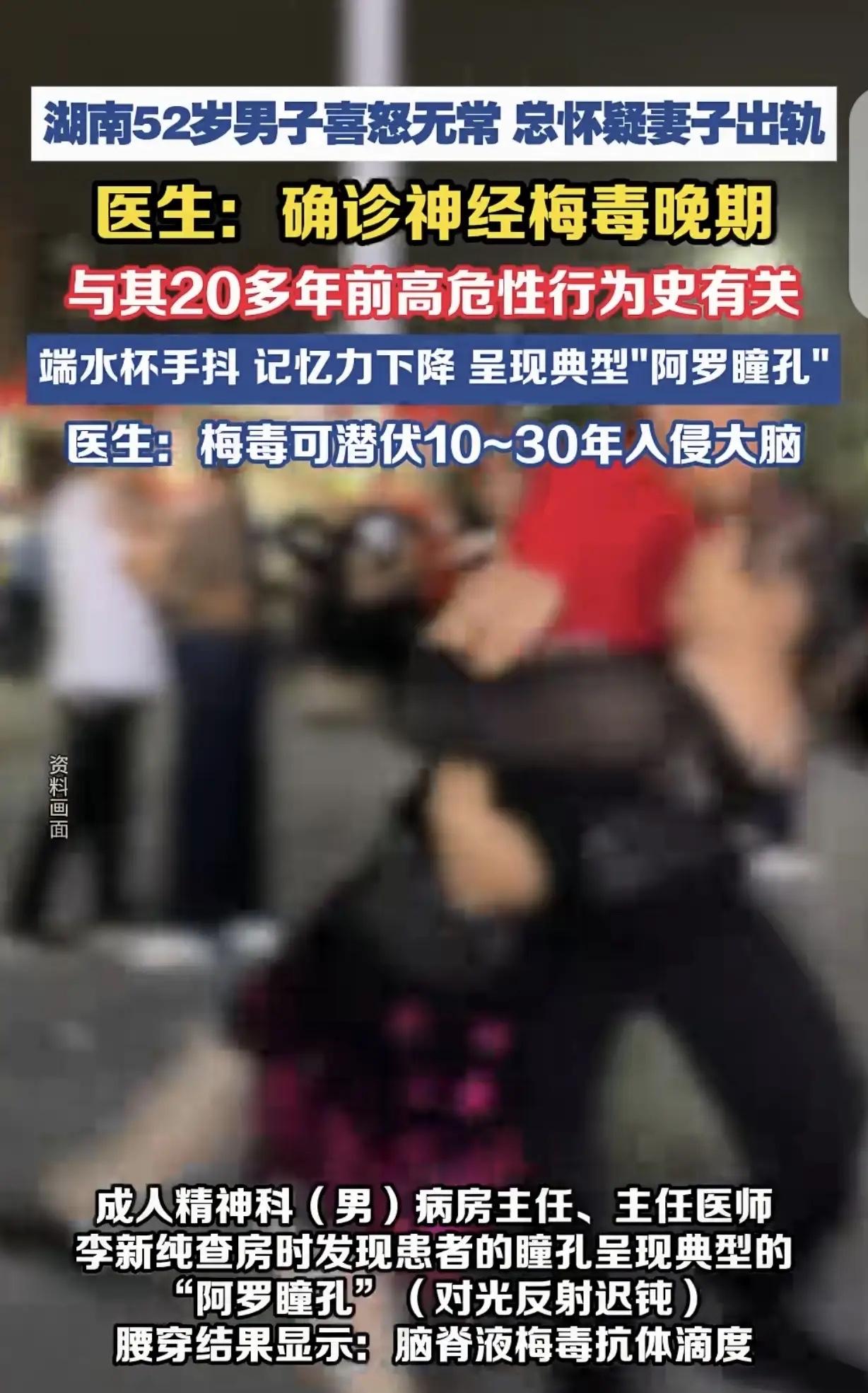 “纵欲过度后遗症!”湖南,一52岁男子突然性格大变,总怀疑妻子出轨,医生诊断为“偏执型精神分裂”,治了一段没效果,又怀疑是“阿尔茨海默症早期”,可寻医问药还是不管用。最后,医生发现男子有典型的“阿罗瞳孔”,确诊他是“神经梅毒晚期”,男子体内梅毒抗体滴度1:1280,高的离谱。男子瞒不住了,这才承认,他20年前,有过高危性行为。医生:梅毒可潜伏10-30年入侵大脑。网友:露馅了吧?若要人不知,除非己莫为。