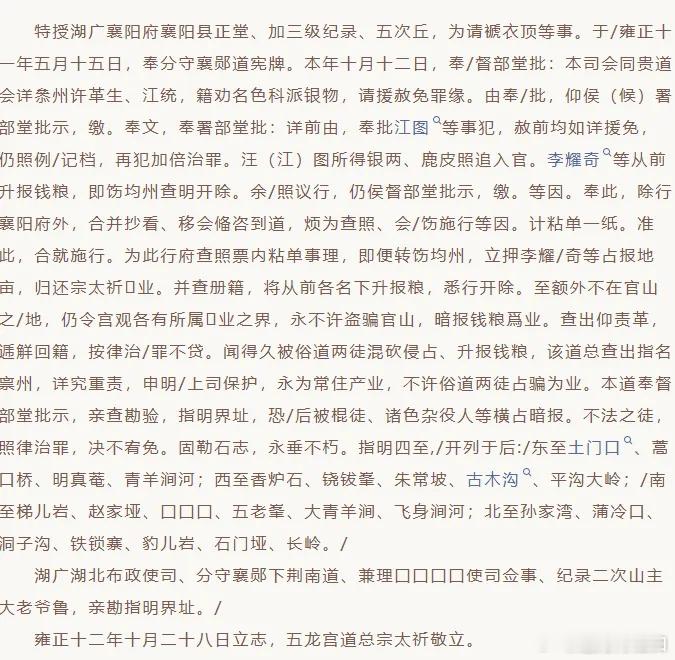 武当圣境丨武当山五龙宫所管四至碑四至碑是我国古代一种以碑刻形式记录土地、山场、建筑、寺院等区域边界(“四至”:东、南、西、北四个方向的界限)的标志性碑刻,兼具产权确权、边界公示、规范管理等多重功能。武当山五龙宫四至碑,立于清雍正十二年(1734),现存于五龙宫北道院。碑身为青石质地,通高150.6厘米、宽68.6厘米。碑身竖排阴刻正文17行,可识别569字,文字均为楷书,部分文字剥蚀。碑额题“五龙宫所管四至”。