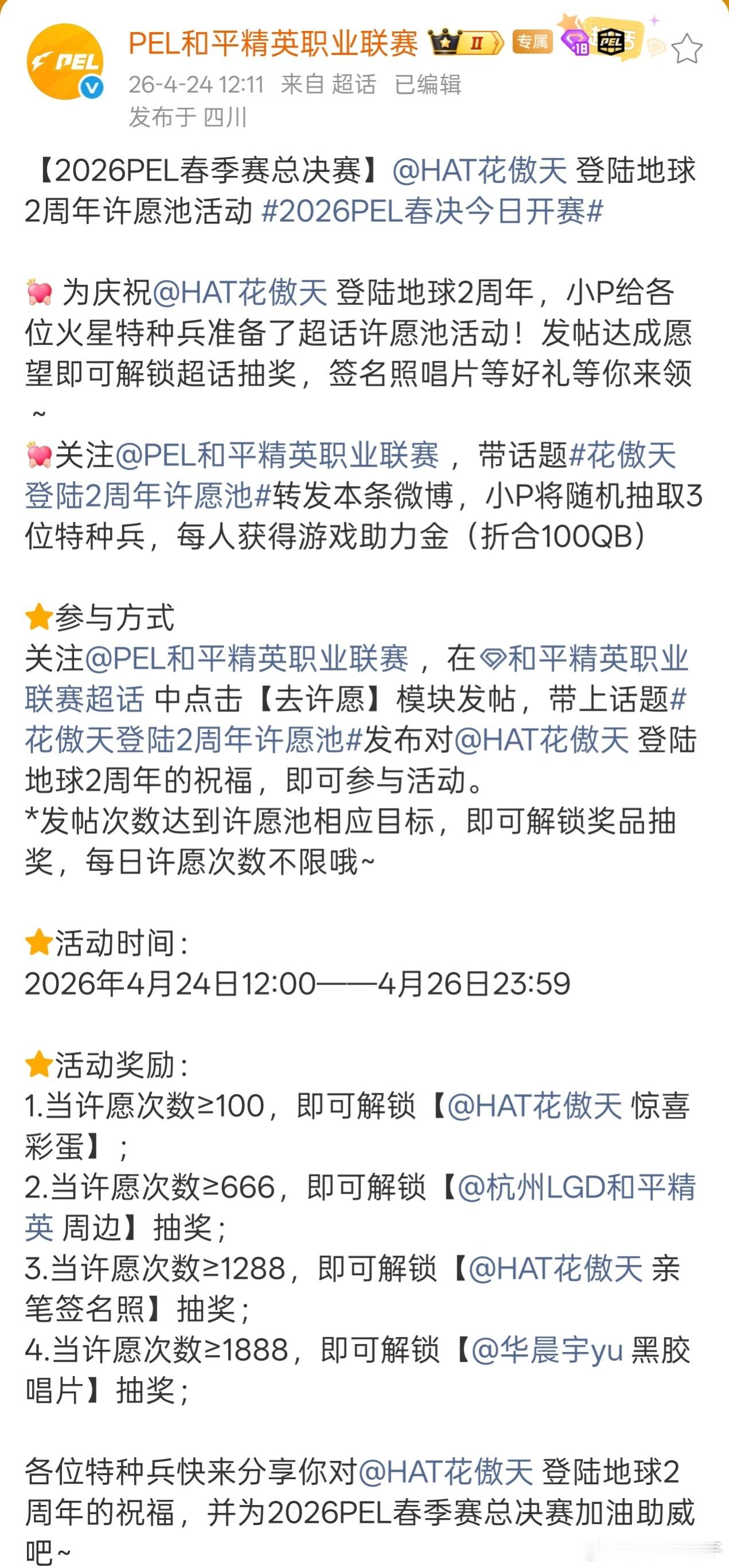 花傲天登陆2周年许愿池2026PEL春决今日开赛 花傲天登陆2周年,PEL发起许