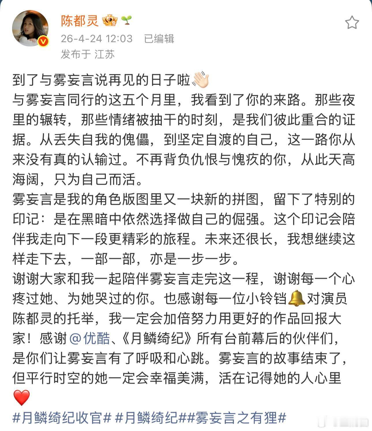 陈都灵月鳞绮纪收官长文 陈都灵发长文与雾妄言告别,没有华丽的辞藻,只有最真挚的期许,这个被她用心塑造的角色,既有大祭司的孤傲,也有对妹妹的温柔,早已深深扎根在观众心里。