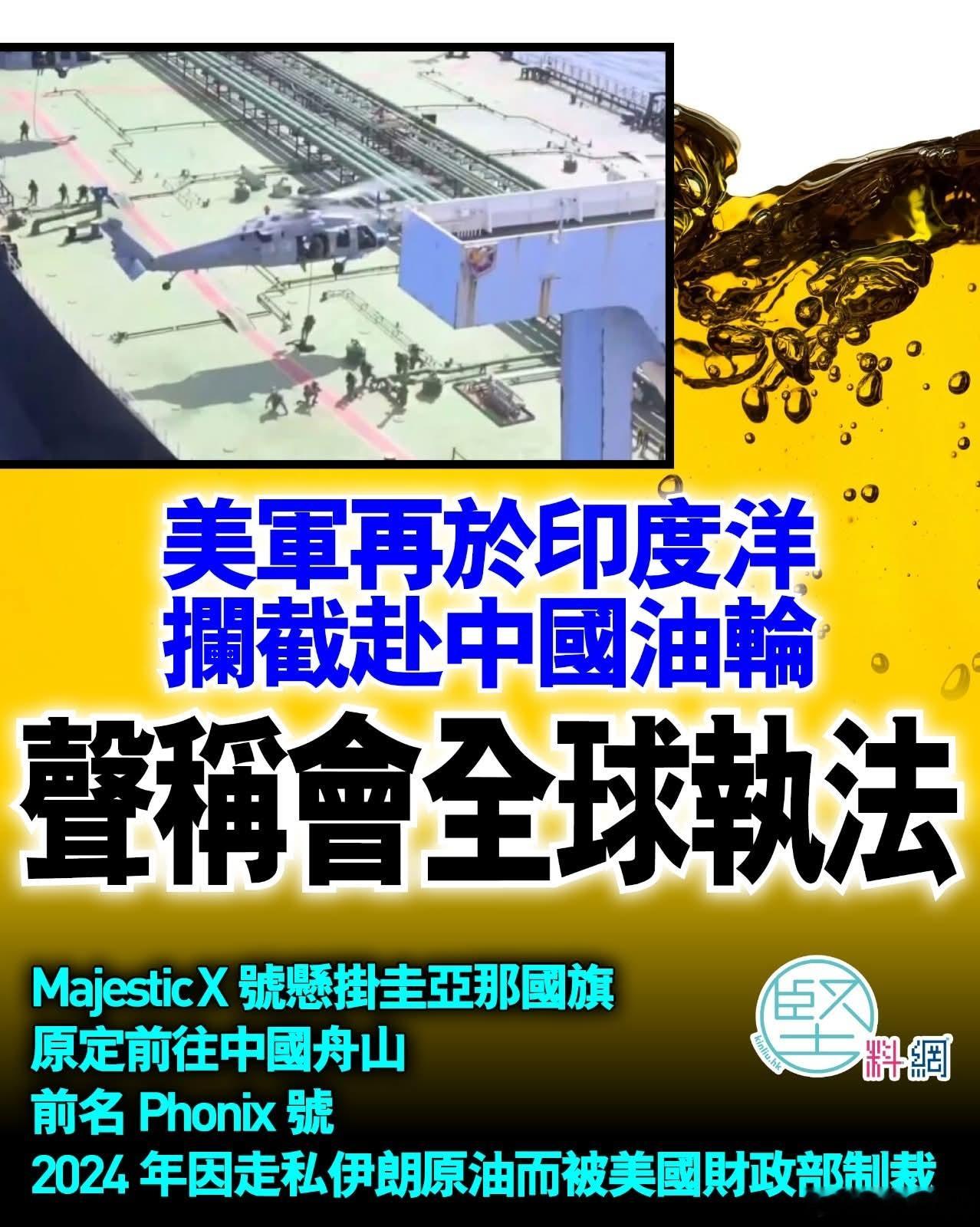美军再于印度洋拦截赴中国油轮,声称会全球执法美国国防部在周四(23日)公布,美军在印太司令部责任区内的印度洋海域,拦截受制裁、据称从伊朗运输石油的无国籍油轮「Majestic X」号,并作登船检查。美方称,公海不是受制裁船只的庇护所,美军会继续在全球执法。Majestic X号悬挂圭亚那国旗,原定前往中国舟山。它前名Phonix号,2024年因运输伊朗原油而被美国财政部制裁。船舶追踪数据显示,它位于斯里兰卡和印尼之间的印度洋被拦截,位置大致与日前被美军扣押的油轮蒂法尼号相若。美国国防部在社交平台发布扣押Majestic X号的影片,拍到美军直升机停在油轮甲板上空后,士兵游绳而下登船,持长枪在甲板上移动。美国国防部表示,美军会继续在全球进行海上执法行动,打击非法网络。美方强调,国际水域不能成为受制裁船只的庇护所,向伊朗提供物资支援的船只,不论在何处美军都会作出拦截,阻止它们在海上自由航行。伊朗称谈判重心已转为彻底停战伊朗巨幅海报宣告霍尔木兹海峡控制权