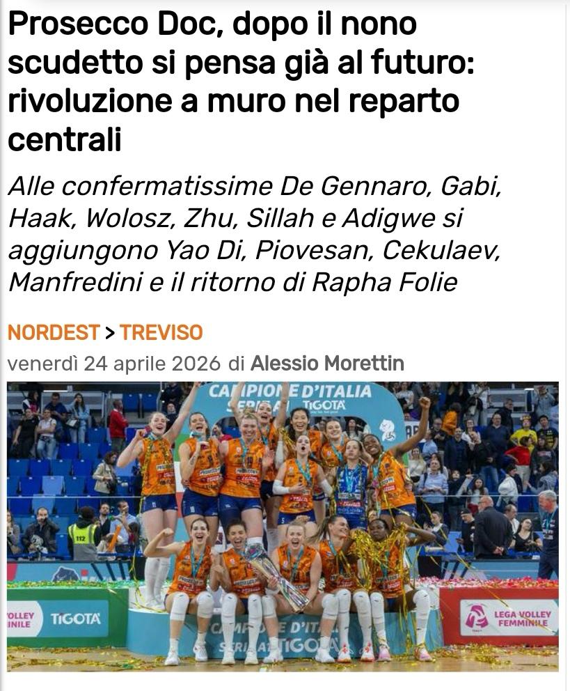 科内利亚诺当地媒体报道,在第九次夺冠后,科内利亚诺正在进行一场中场防守革命,除了已经确定的德吉纳罗、加比、哈克、沃沃什、朱婷、西拉赫外,阿迪格维及姚迪、皮奥维桑、切库拉耶夫、曼弗雷迪尼即将加入,在美国联赛LOVB休斯敦队效力的老将弗里也将回归。